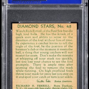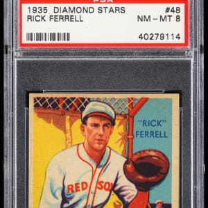 Graded NM-MT 8 by PSA. Boston Red Sox Hall of Fame catcher Rick Ferrell. Ranks in the upper 8% of all similar copies evaluated by the grading service with 3 higher. Part of a 1934-1936 Diamond Stars PSA graded near set break available throughout this auction.