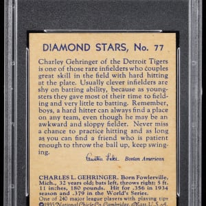 Graded NM-MT 8 by PSA. A profile in diamond fundamentals, the exacting Charlie Gehringer scrutinizes an incoming pitch on the offered 1934-1936 Diamond Stars #77 gum card. This horizontal action pose is simply superb by exhibiting four sharp corners, crisp edges and shimmering art deco surface accents with perfectly contrasted flesh tones. The dated 1935 blue back (mislabeled as 1934 on the flip) is clean. Of the 120 total copies evaluated of the player/back color combination, this Detroit Tigers Hall of Famer ranks as 1 of 9 at the grading level with none higher (top 8%)! Part of a 1934-1936 Diamond Stars PSA graded set break available throughout this auction.