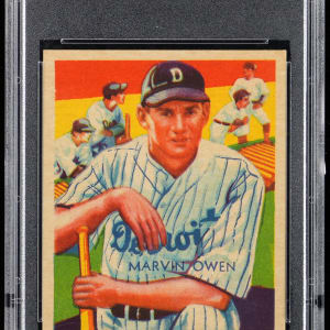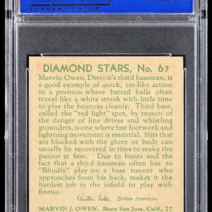 Graded NM-MT 8 by PSA. Detroit Tigers third baseman Marvin Owen. Ranks in the upper 16% of all similar copies evaluated by the grading service with 5 higher. Part of a 1934-1936 Diamond Stars PSA graded near set break available throughout this auction.