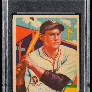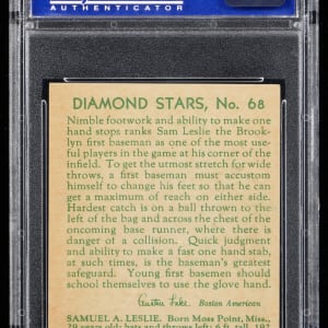 Graded NM-MT 8 by PSA. Brooklyn Dodgers first baseman Sam Leslie. Ranks in the upper 17% of all similar copies evaluated by the grading service with 7 higher. Part of a 1934-1936 Diamond Stars PSA graded near set break available throughout this auction.