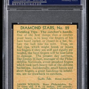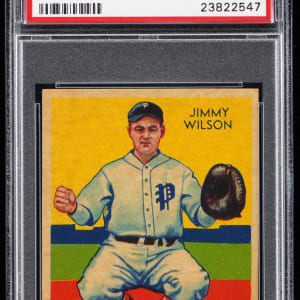 Graded NM-MT 8 by PSA. Philadelphia Phillies All-Star catcher/manager Jimmie Wilson. Ranks in the upper 12% of all similar copies evaluated by the grading service with 2 higher. Part of a 1934-1936 Diamond Stars PSA graded near set break available throughout this auction.