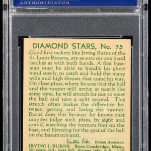 Graded NM-MT+ 8.5 by PSA. St. Louis Browns first baseman Irving (Jack) Burns. A superior 90-year-old copy that ranks in the upper 8% of all similar copies evaluated by the grading service with 8 higher. Part of a 1934-1936 Diamond Stars PSA graded near set break available throughout this auction.