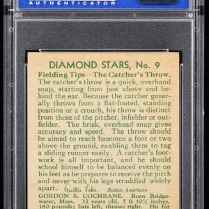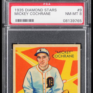 Graded NM-MT 8 by PSA. Detroit Tigers Hall of Famer Mickey Cochrane displays perfect catching form on this superb 1934-1936 Diamond Stars #9 high-grade gum card. This centered "Black Mike" exhibits outstanding eye appeal and ranks in the upper 10% of all similar copies evaluated by the grading service with 4 higher. Part of a 1934-1936 Diamond Stars PSA graded near set break available throughout this auction.