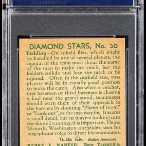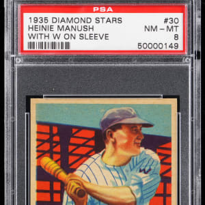 Graded NM-MT 8 by PSA. Washington Senators Hall of Fame outfielder Henry (Heinie) Manush. This beautifully centered "With "W" on Sleeve" version ranks in the upper 7% of all similar copies of the player/variation combination judged by the authenticator. Part of a 1934-1936 Diamond Stars PSA graded near set break available throughout this auction.