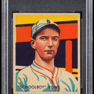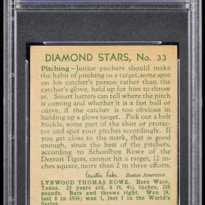 Graded NM-MT 8 by PSA. Lynwood (Schoolboy) Rowe is at the head of the class with the offered high-grade 1934-1936 Diamond Stars #33 gum card. This Detroit Tigers All-Star pitcher ranks in the upper 9% of all similar copies evaluated by the grading service with 4 higher. Part of a 1934-1936 Diamond Stars PSA graded near set break available throughout this auction.