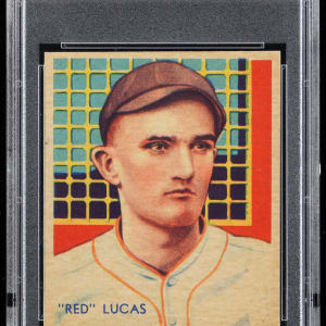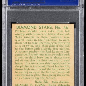 Graded NM-MT 8 by PSA. Cincinnati Reds pitcher Charles (Red) Lucas. Ranks in the upper 13% of all similar cards judged by the authenticator with 6 higher. Part of a 1934-1936 Diamond Stars PSA graded near set break available throughout this auction.
