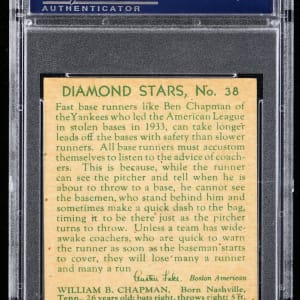 Graded NM-MT 8 by PSA. New York Yankees All-Star Ben Chapman. Ranks in the upper 9% of all similar copies evaluated by the grading service with 2 higher. Part of a 1934-1936 Diamond Stars PSA graded near set break available throughout this auction.