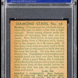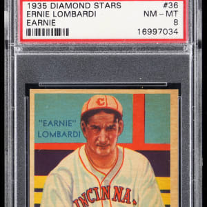 Graded NM-MT 8 by PSA. Cincinnati Reds Hall of Fame catcher Ernie "Earnie" Lombardi. This first name error of the affable "Schnozz" is razor-sharp and meets the strict criteria needed for its overall evaluation. Ranks in the upper 9% of all similar copies judged by the authenticator with 6 higher. Part of a 1934-1936 Diamond Stars PSA graded near set break available throughout this auction.