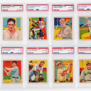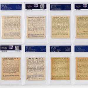 Each graded from EX 5 to EX-MT+ 6.5 by PSA. Vivid "art deco" renderings are fashioned on these (8) classic 1934-1936 Diamond Stars featuring a pair of Hall of Famers. Unless noted, all low numbers are green backs. Includes: PSA EX-MT+ 6.5: (2 cards) with #66 Medwick, #85 Solters; PSA EX-MT 6: (5 cards) with #12 D. Walker (1936 blue back), #13 Blaeholder, #23 Hallahan, #24 Adams, #96 Riggs and PSA EX 5: #31 Cuyler (1936 blue back). Part of a 1934-1936 Diamond Stars PSA graded near set break available throughout this auction.