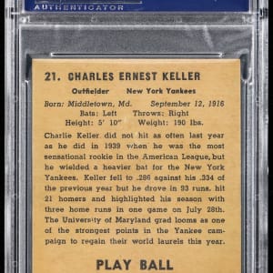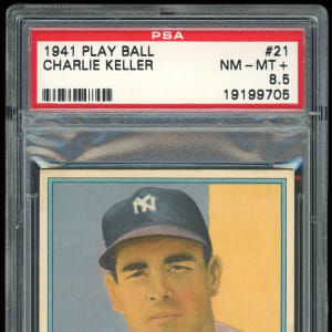 PSA Registry Collectors! Graded NM-MT+ 8.5 by PSA. Charlie "King Kong" Keller was a beast at the plate who played on four New York Yankees World Series championship teams. The prodigious slugger stars on this 1941 Play Ball #21 high-grade single. The pinstriped hero is accurately centered with untouched corners, creamy edges and "picture perfect" surface registration set against a vibrant two-color background setting. The reverse, which details the University of Maryland alum's exploits, is problem-free. Of the 326 total copies judged by the authenticator, this prewar classic survives as 1 of 3 at the grading level with only two better (top 1.5%). Part of a 1941 Play Ball PSA graded near set break available throughout this auction.