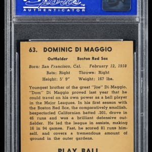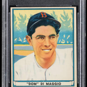 Graded NM-MT 8 by PSA. "Joltin' Joe's" little brother makes quite a name for himself on the offered 1941 Play Ball #63 Dom DiMaggio high number. This elite copy of "The Little Professor" is quite attractive and ranks in the upper 10% of all similar copies judged by the authenticator with only six higher. Part of a 1941 Play Ball PSA graded near set break available throughout this auction.