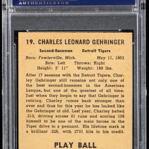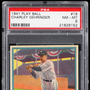 Graded NM-MT 8 by PSA. The toolsy "Mechanical Man" swings away against a bunting-clad backdrop on the offered 1941 Play Ball #19 Charlie Gehringer high-grade gum card. This sharp Detroit Tigers Hall of Famer ranks in the upper 8% of all similar copies judged by the third-party authenticator with 6 higher. Part of a 1941 Play Ball PSA graded near set break available throughout this auction.
