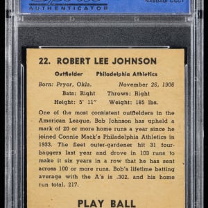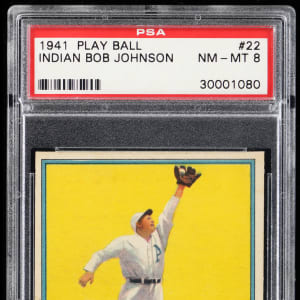 Graded NM-MT 8 by PSA. Philadelphia Athletics All-Star (Indian) Bob Johnson. Ranks in the upper 12% of all similar copies judged by the authenticator with only 4 higher. Part of a 1941 Play Ball PSA graded near set break available throughout this auction.