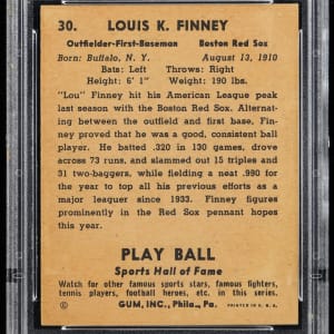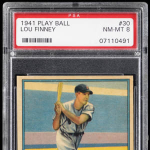 Graded NM-MT 8 by PSA, Boston Red Sox All-Star Lou Finney. Ranks in the upper 11% of all similar copies evaluated by the grading company with 4 higher. Part of a 1941 Play Ball PSA graded near set break available throughout this auction.