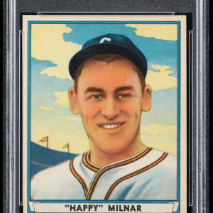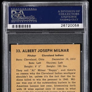 Graded NM-MT 8 by PSA. Cleveland Indians All-Star Al (Happy) Milnar. Ranks in the upper 11% of all similar copies judged by the authenticator with only 3 higher. Part of a 1941 Play Ball PSA graded near set break available throughout this auction.