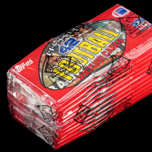 A gridiron bonanza of (12) 1985 Topps Football grocery rack packs! Each storefront survivor will yield 42 cards plus three sticks of bubble gum. From this condition-sensitive edition, mine high-grade gems of John Elway (second-year), Dan Marino (second-year), Warren Moon RC and additional Hall of Fame rookies! It is unknown which players are found on the fronts/backs. The bundle comes shrink-wrapped by Baseball Card Exchange (owned by Steve Hart, the foremost expert on unopened material).