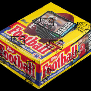 Condition Sensitive Black Borders! Tantalizing 1985 Topps Football unopened wax box of (36) packs. These 15-card wrappings could yield high-grade copies of John Elway second-year, Dan Marino second-year and Warren Moon RC. The entire box comes shrink-wrapped by Baseball Card Exchange (owned by Steve Hart, the foremost expert on unopened material).
