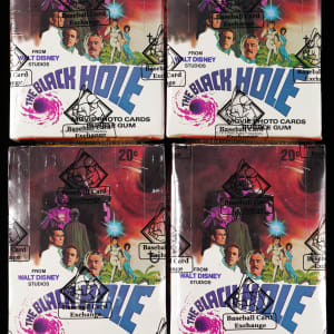 Blast your non-sport collection into another dimension with the offered quartet of 1979 Topps The Black Hole unopened wax boxes. Each unsearched container will deliver (36) 10-card packs plus a sticker and stick of bubble gum per. Find multiple 88-card/22-sticker sets in addition to several high-grade singles. Each box comes shrink-wrapped by Baseball Card Exchange (owned by Steve Hart, the foremost expert on unopened material). The size/weight of this item requires that there will be an additional shipping charge for this lot.