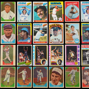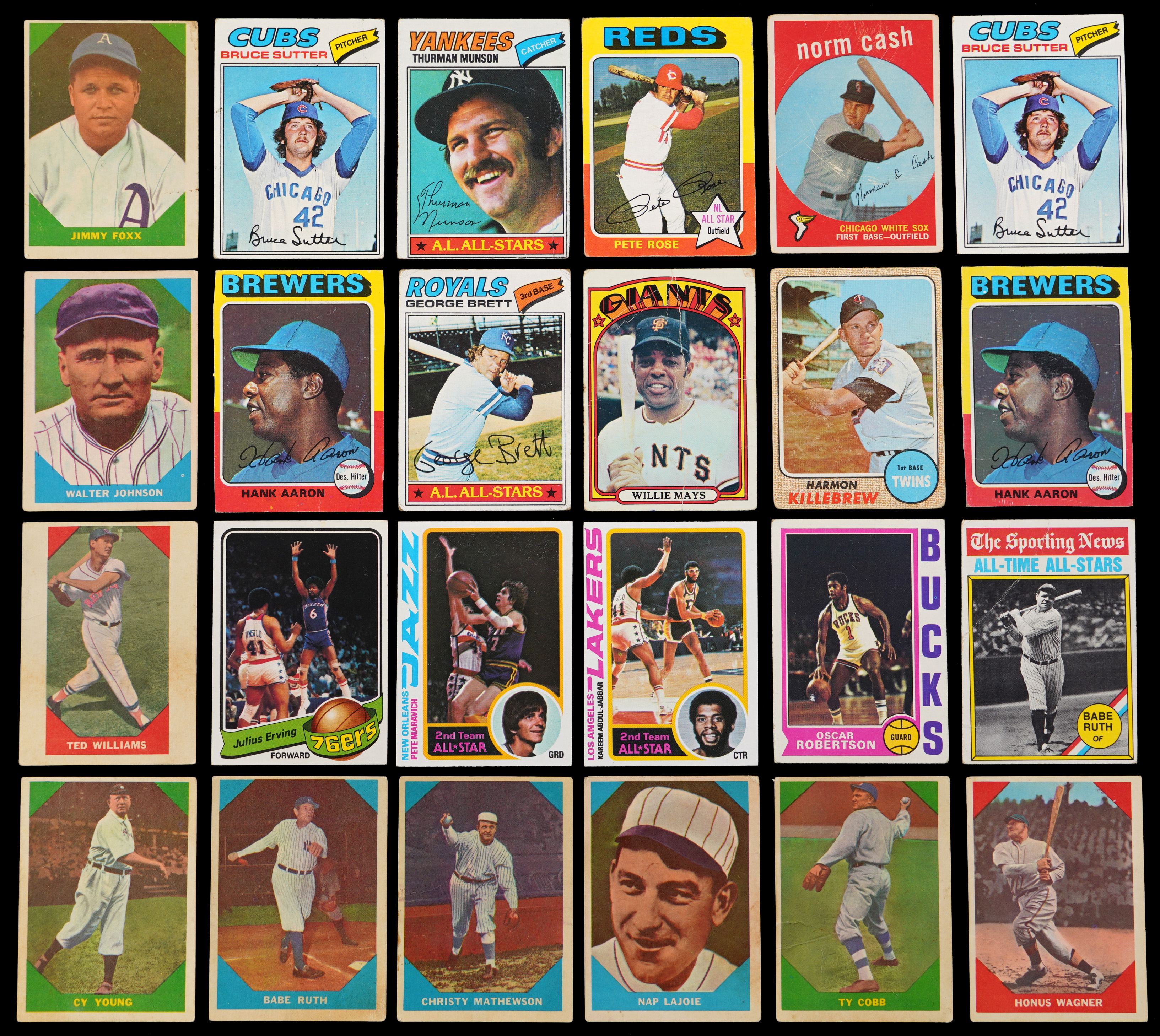Topps Baseball: (117 cards) with 1959 Topps: (37 cards, average GD, includes 25 high numbers) with #509 Cash RC (GD); 1960 Fleer Greats: (37 cards, average GD) with #1 Lajoie (FR), #2 Mathewson (FR), #3 Ruth (VG), #6 W. Johnson (GD), #42 Cobb (FR), #47 C. Young (GD), #53 Foxx (FR), #62 Wagner (VG), #72 T. Williams (FR); 1968 Topps: (2 cards, both FR) with #220 Killebrew; 1968 Topps Game: #6 Clemente (PR, writing); 1969 Topps Deckle Edge: #32 Marichal (GD, stain); 1972 Kellogg’s All-Time Baseball Greats: #2 Hornsby (GD); 1972 Topps: (3 stars, average FR) with #49 Mays (PR); 1973 Topps: (4 stars, average FR); 1974 Kellogg’s: #38 Morgan (cracked); 1974 Topps: #160 B. Robinson (GD); 1975 Topps: (3 cards) with #320 Rose (GD), (2) #660 Aaron (both trimmed); 1976 Topps: (3 All-Time All-Stars, average FR) with #345 Ruth (PR); 1977 Topps: (7 stars, average FR to GD) with (2) #144 Sutter RC (VG, FR), #170 Munson (GD), #580 Brett (FR); 1978 Topps: (8 stars, average VG-EX); 1979 Topps: (8 stars, average VG);