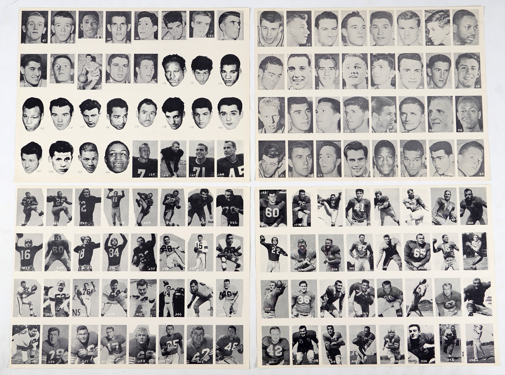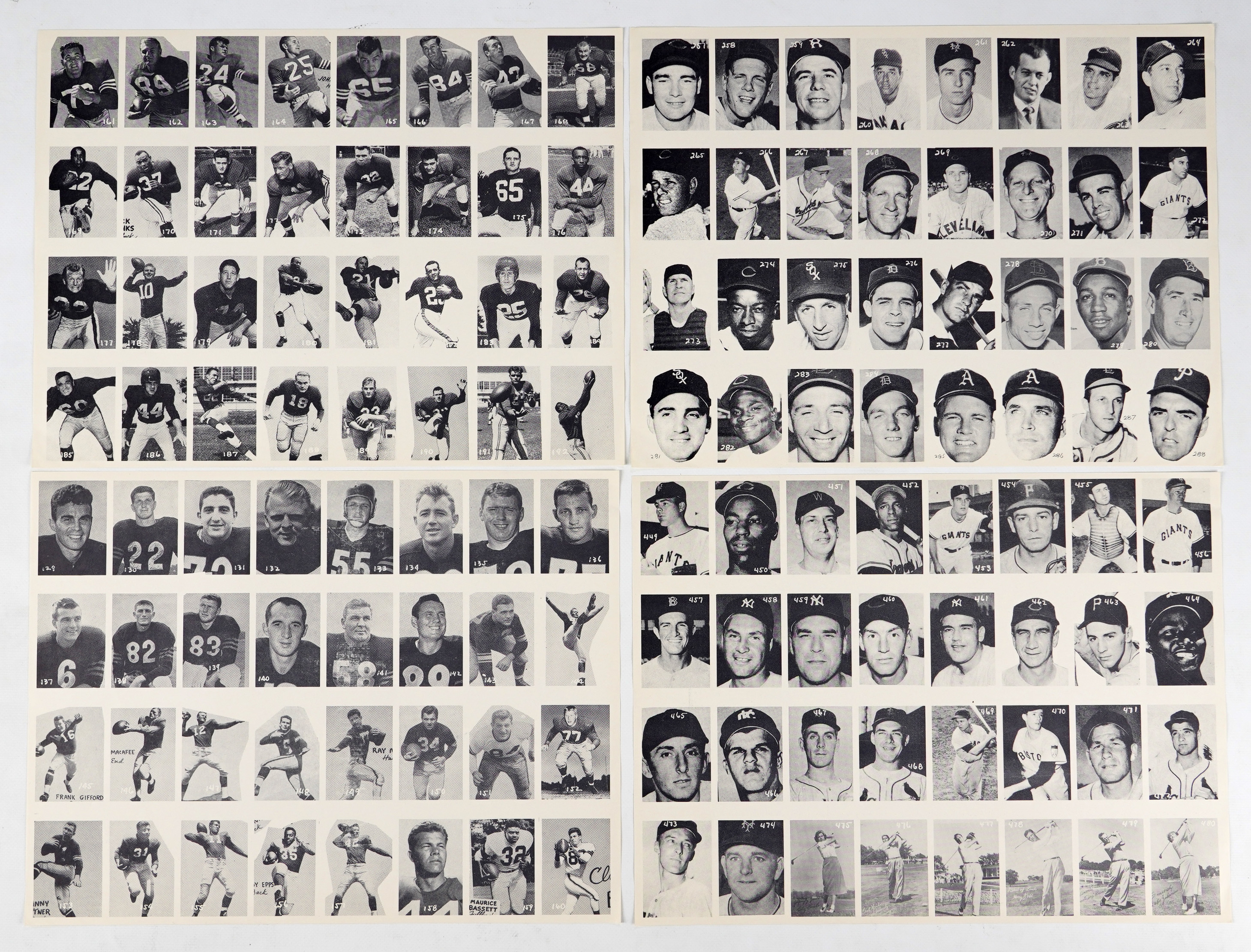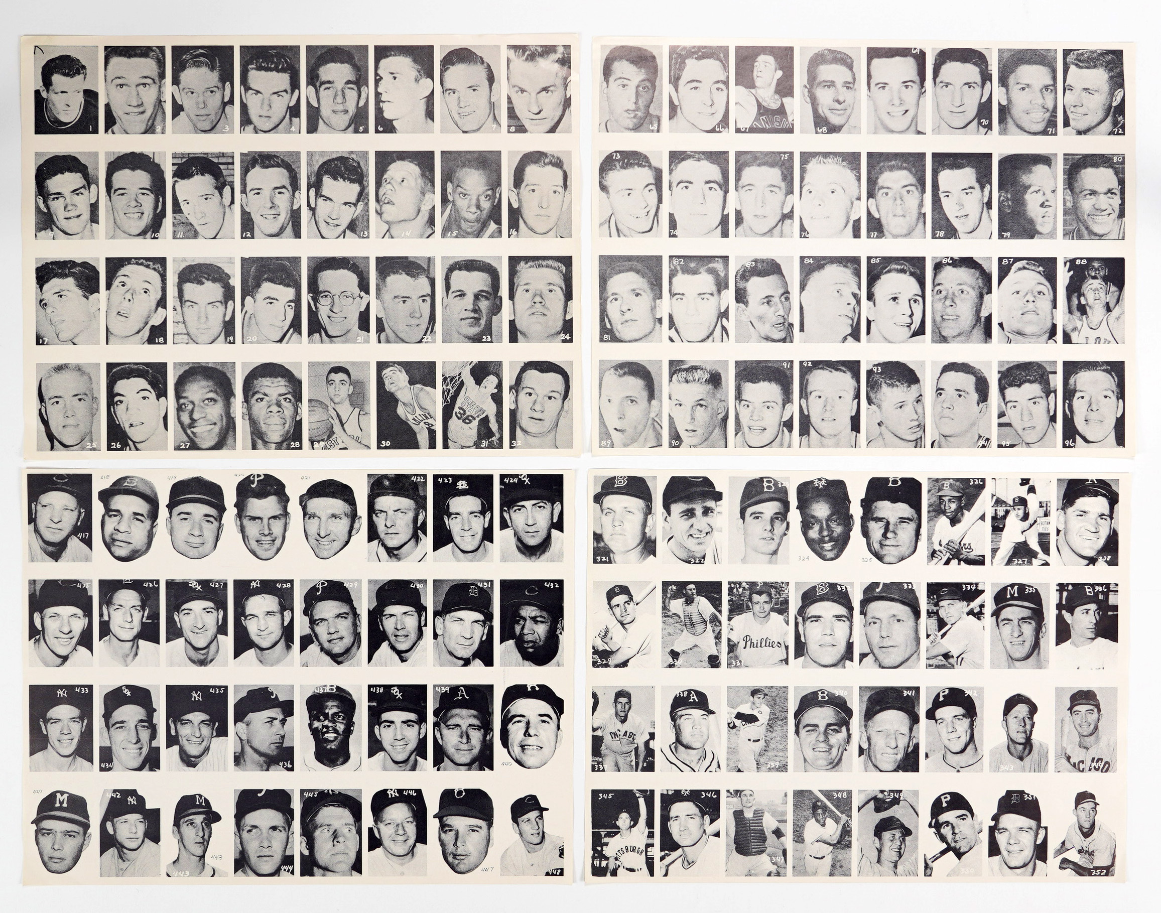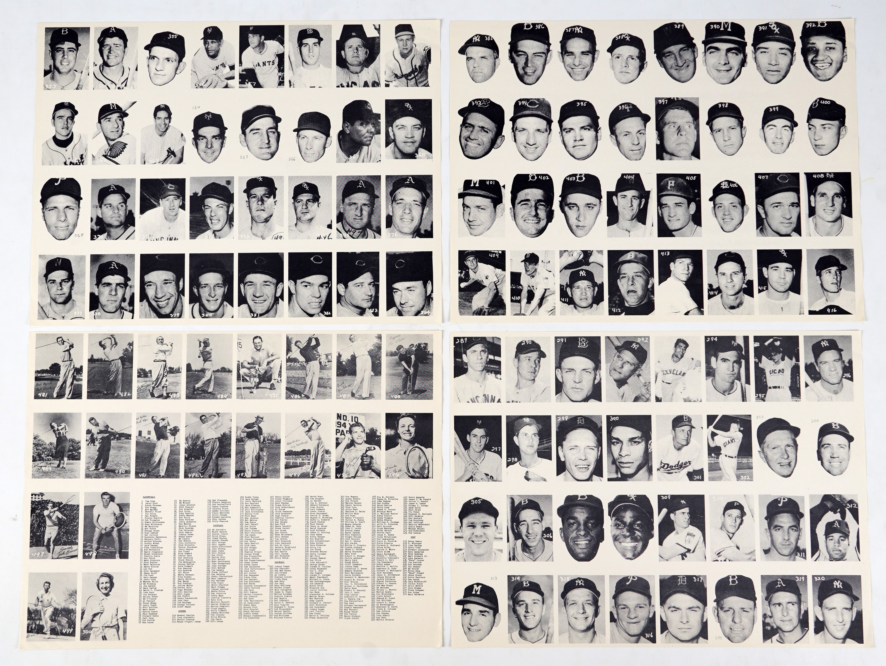 Scarce 1955 All-American Sports Club set of (16) sheets. A total of 500 professional baseball, football and basketball players along with additional golfers and boxers are arranged over the relatively crisp black-and-white pages. Better names include: #1 Gola (slight bend), #21 Mikan (slight bend), #61 B. Russell (slight bend), #83 Cousy, (slight crease) #130 Blanda, #145 Gifford, #201 Layne, #246 Graham, #259 Reese, #280 T. Williams, #284 Kaline, #287 Musial, #304 Snider (slight bend), #348 Mays, #387 Berra, #418 Campanella, #437 J. Robinson, #442 Mantle, #480 Zaharias and #493 Snead. Sheets, as a whole, present in (EX to NM) condition throughout with variance for certain individual players to be expected.
