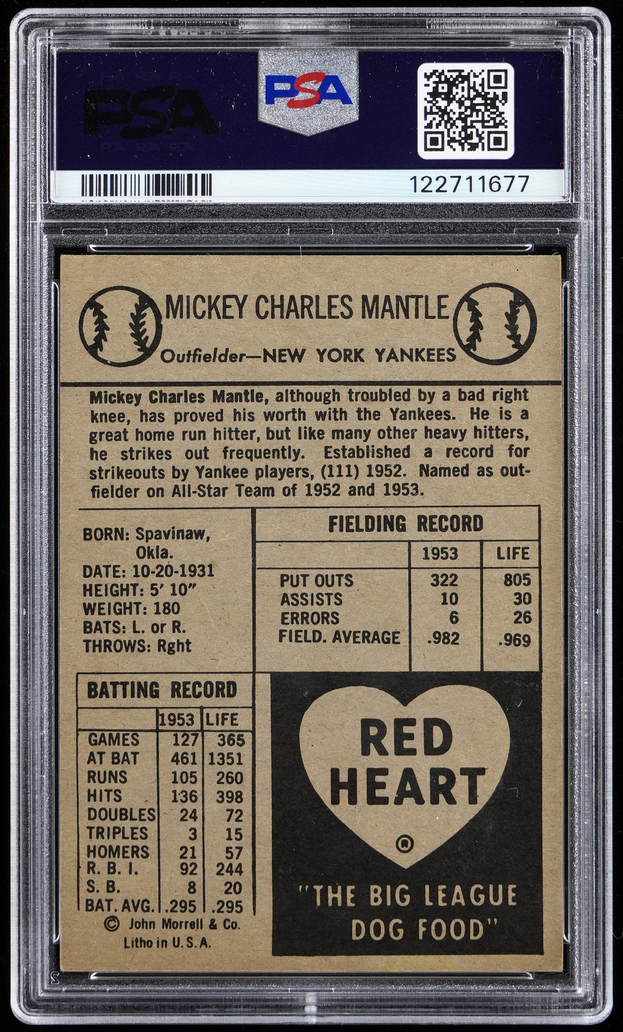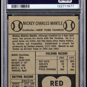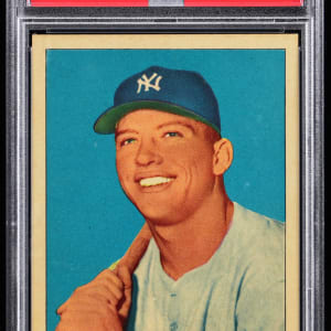 Graded VG-EX+ 4.5 by PSA. A young Mickey Mantle showcases his pearly whites on the offered 1954 Red Heart Dog Food single. This New York Yankees Hall of Fame phenom is crease-free with only very minor corner touches and a clean back.