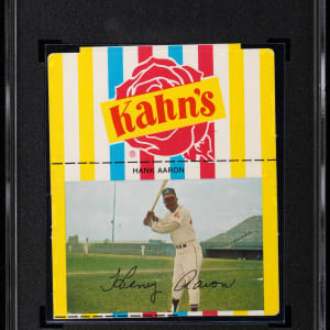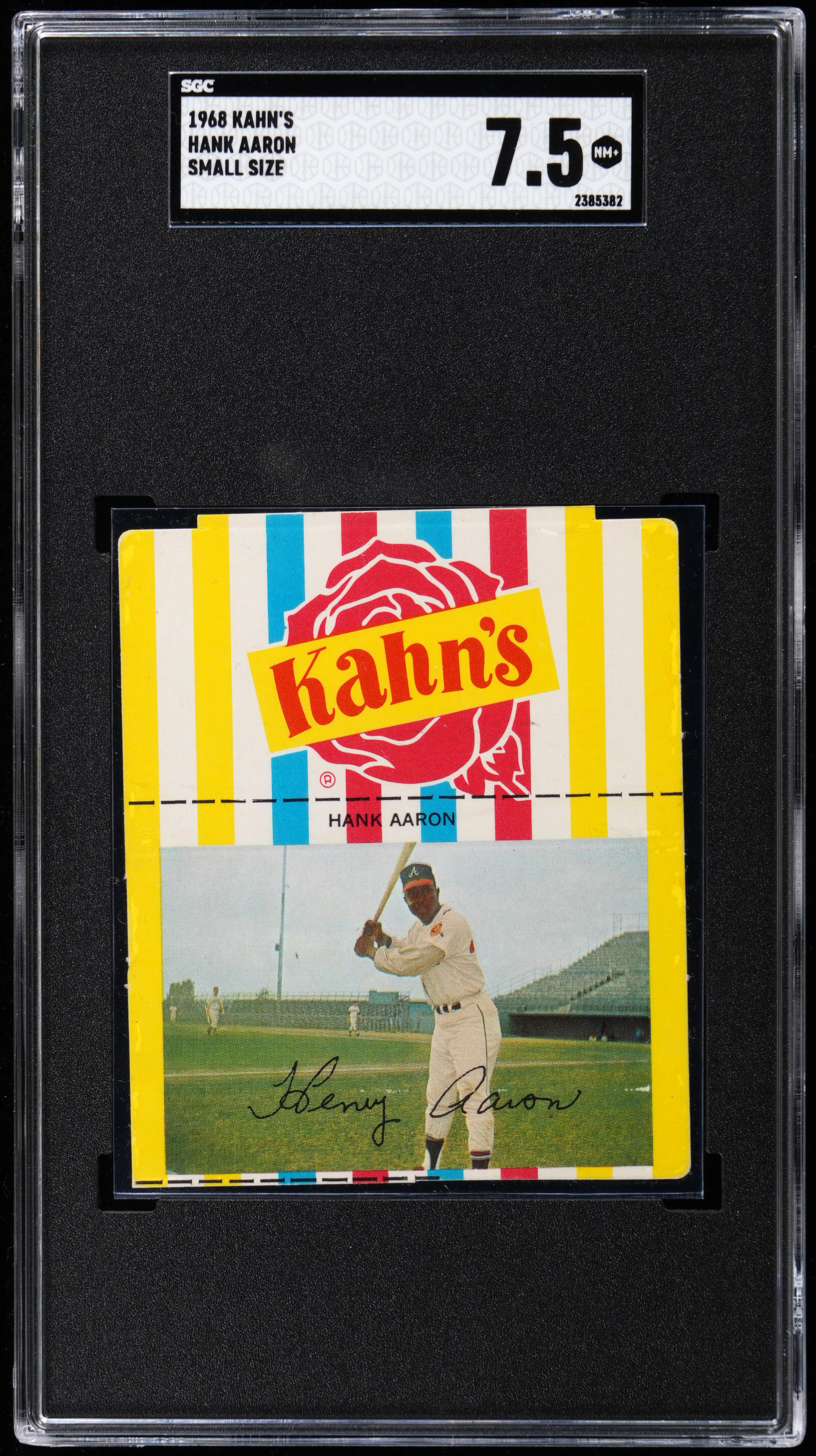 Graded NM+ 7.5 by SGC. Stunning 1968 Kahn's Wieners Hank Aaron small size variation. Only 6 total copies of the player/size combination have been judged by the grading service in any condition! Atlanta Braves Hall of Fame slugger.