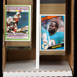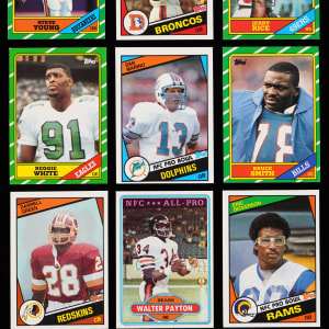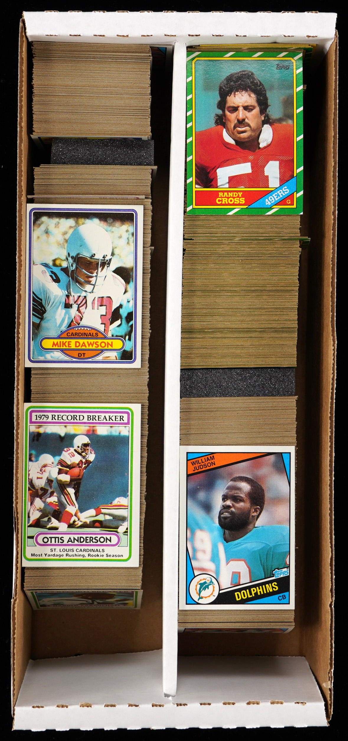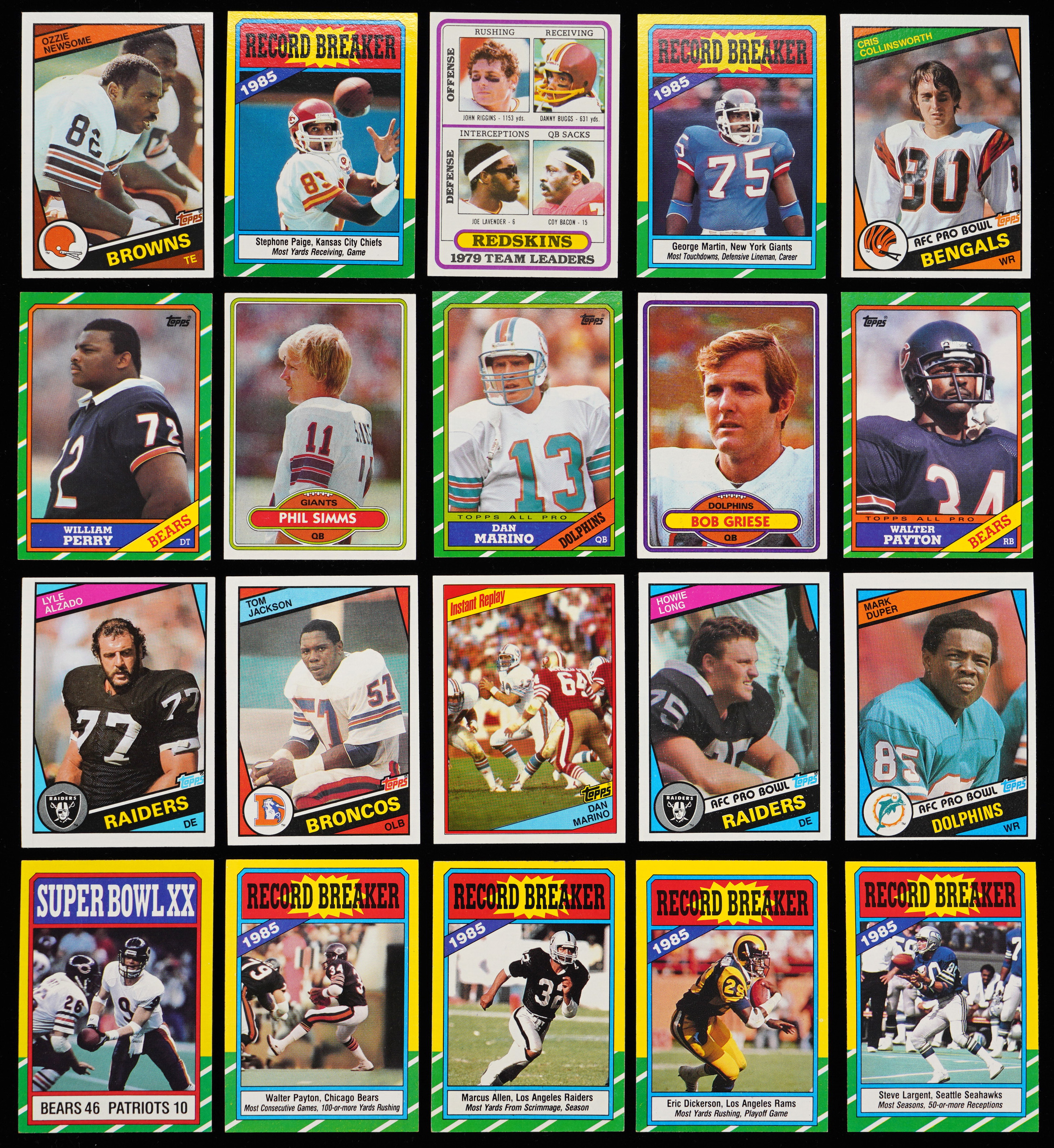 Lock up the offered quartet of 1980, 1983, 1984 and 1986 Topps Football complete sets. These 396-card editions average (NM to NM-MT) condition with the key generally presenting similarly. Features upper-tier rookies of M. Allen, Dickerson, Elway, D. Green, H. Long, Marino (grades EX), McMahon, Rice, Simms (grades EX), Singletary, B. Smith, R. White and S. Young. The size/weight of this item requires that there will be an additional shipping charge for this lot.