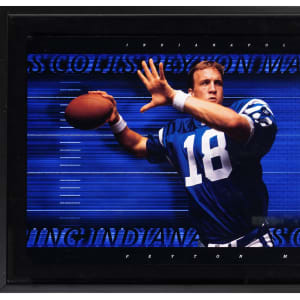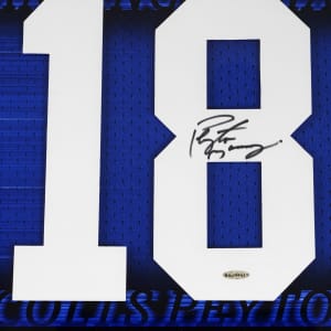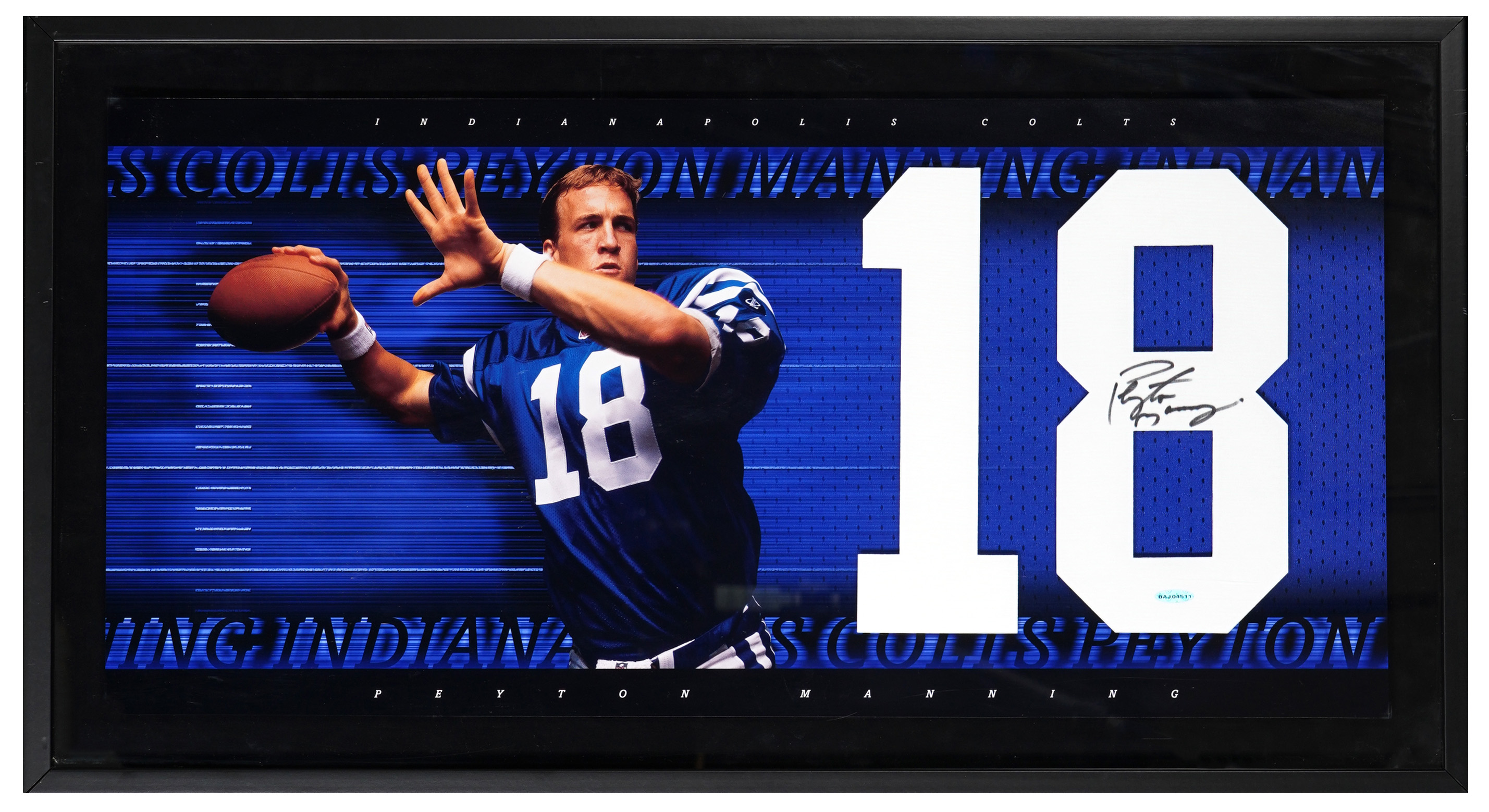 “The Sheriff” draws a bead on his intended target, in this colossal Peyton Manning framed signature display. A 5X NFL MVP, Manning spent the bulk of his career with the Indianapolis Colts. Professionally framed to overall dimensions of 37” x 20”, this dynamic display focuses on Manning’s jersey number 18, which is raised in dimensional fashion, against a Colts blue background. Seen at left, Manning is pictured with a gunfighter’s glare in his eyes, as he prepares to throw a bullet. Manning’s signature over the middle on the number 8 is a potent application, in high contrast to the white background. The frame shows minimal wear and is ready for immediate display.