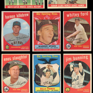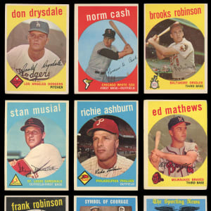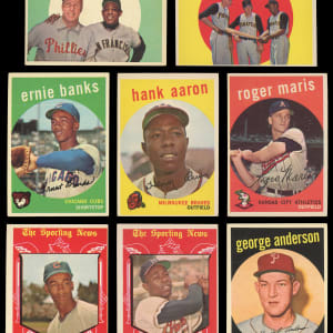 Secure over 90% of the 1959 Topps edition with the offered near set of (530/572) cards. This mid-grade compilation has an approximate condition breakdown of 20% (EX or better), 25% (VG-EX), 35% (VG) and 20% (GD or lesser) with the challenging high series generally presenting on level with the more available numbers. Highlights include: #149 Bunning (EX), #150 Musial (EX), #155 Slaughter (EX), #202 Maris (VG), #300 Ashburn (VG-EX), #317 Ashburn/Mays (VG), #338 S. Anderson RC (VG-EX), #350 Banks (VG-EX), #380 Aaron (VG), #387 Drysdale (VG), #430 Ford (GD), #435 F. Robinson (GD), #439 B. Robinson (VG), #450 Mathews (FR), #464 Mays Catch (VG), #467 Aaron HR (VG), #509 Cash RC (GD), #515 Killebrew (VG), #543 Corsair Trio/Clemente (VG-EX), #550 Campanella (EX), #559 Banks AS (VG-EX), #561 Aaron AS (VG), #562 Kaline AS (VG-EX), #571 Spahn AS (VG-EX) and #572 Pierce AS (EX).