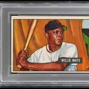 Graded VG-EX 4 by PSA. A focused Willie Mays concentrates his offensive efforts against a makeshift batting cage on this clean 1951 Bowman #305 rookie card. This horizontal high number is crease-free with only mild corner wear and slightly distinguishable print lines. The colors on the New York Giants Hall of Famer's batting stance are intense and the overall appearance of the front is fresh and appealing. The reverse, which details Mays' prospect status displays only a hint of reverse wax staining common to having been pulled from a penny back. A "new to hobby" example that has been held by our consignor's family since the product's release almost 75 years ago.