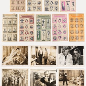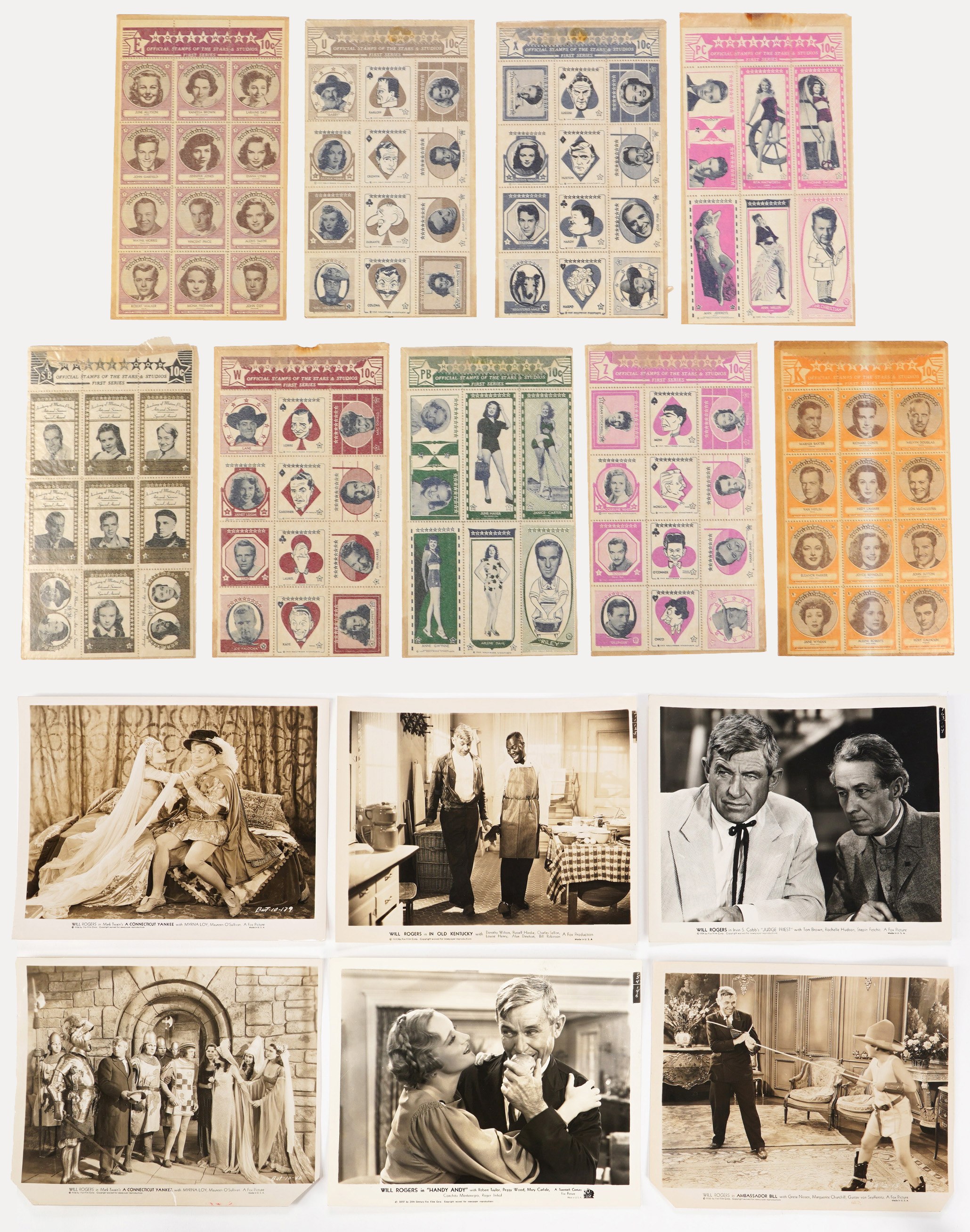 These (9) uncut sheets of Hollywood Starstamps average Excellent condition, still in their glassine-style envelopes. The banner across the top states, “10c for the Official Stamps of the Stars and Studios.” They all are First Series. Several different styles are represented, one with portraits of the stars, another with artist caricatures, another larger size with full length pictures. Highlights include June Allyson, Vincent Price, Harry James, Ann Miller, Rita Hayworth, Jane Wyman, Frank Sinatra, Boris Karloff, Janet Leigh and Harpo Marx.
