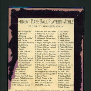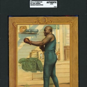 The Galveston Giant! Graded Authentic, Altered by SGC. Jack Johnson, the first Black heavyweight champion displays perfect fighting form on the offered 1911 T9 Turkey Red Cabinets #76 premium. The front displays particularly well with a crease-free surface and vivid pugilist details set against a largely unchipped wood framed design scheme. Scrapbook residue impacting over 70% of the reverse perimeter accounts for its overall evaluation.