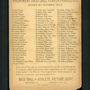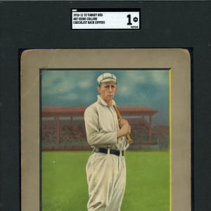 Graded POOR 1 by SGC. "Cocky" appears ready to knock out one of his 3,315 career hits on the offered 1910-1911 T3 Turkey Red Cabinets #87 Eddie Collins premium. This Philadelphia Athletics Hall of Famer displays an unmarked checklist back.