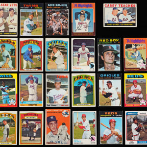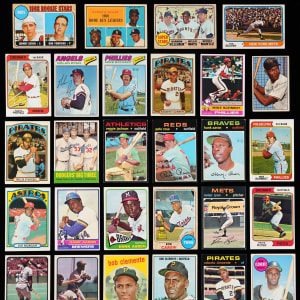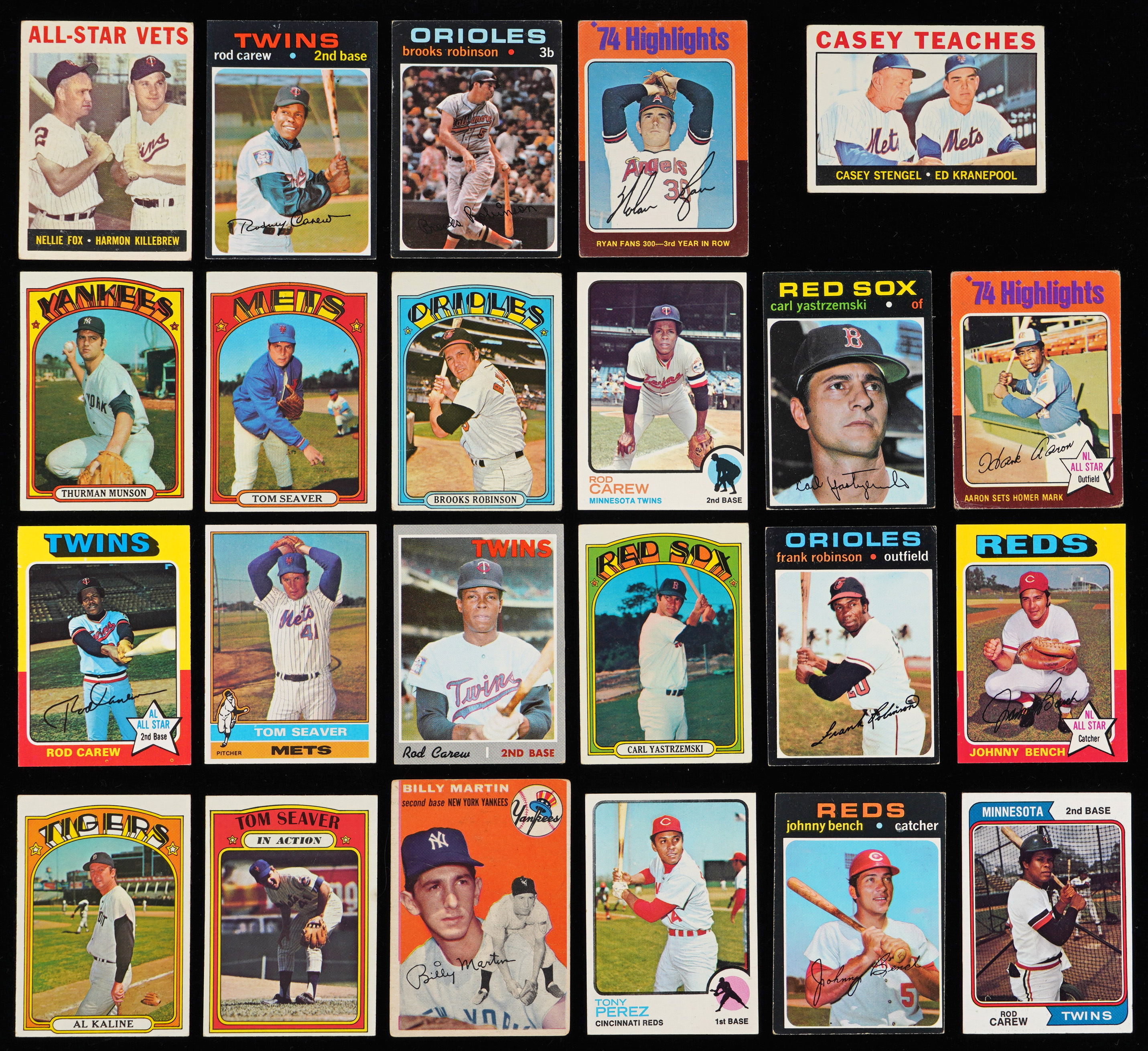 1970s Stars: (38 cards, average VG to EX) with 1970 Topps #290 Carew (VG), 1971 Topps: #20 R. Jackson (VG-EX), #100 Rose (EX), #210 Carew (EX), #250 Bench (VG), #300 R. Jackson (VG), #400 Aaron (VG), #513 Ryan (EX), #530 Yastrzemski (VG-EX), #630 Clemente (EX), #640 F. Robinson (EX); 1972 Topps: #37 Yastrzemski (VG), #309 Clemente (FR), #441 Munson (EX), #445 Seaver (VG), #550 B. Robinson (FR), #600 Kaline (VG-EX); 1973 Topps: #50 Clemente (VG-EX), #130 Rose (VG), #330 Carew (VG-EX); 1974 Topps: #80 Seaver (VG-EX), #283 Schmidt (VG-EX), #300 Rose (VG); 1975 Topps: #1 Aaron HL (FR), #5 Ryan HL (GD), #260 Bench (EX); 1976 Topps: #480 Schmidt (EX-MT), #550 Aaron (GD); 1977 Topps #550 Ryan (GD)