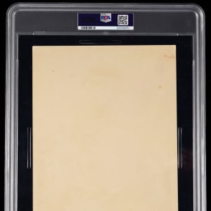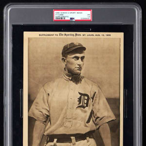 Graded FAIR 1.5 by PSA. Baseball’s all-time leading hitter looks rather distinguished on the offered 116-year-old artifact. Issued as part of the 1909-1913 M101-2 Sporting News Supplements series, this dashing image captured the usually fierce Ty Cobb in a serene pose. Gazing toward the field, “The Georgia Peach” appears relaxed and confident, perhaps contemplating the annihilation of his opponent's fastball. Despite moderate perimeter wear and bowing to the paper-thin stock, this dated August 12, 1909 rendering of the Detroit Tigers Hall of Famer presents as a higher grade example. Only 25 total copies have been validated by the third-party grading service in any condition!