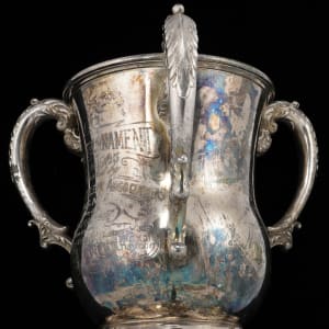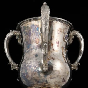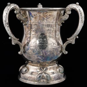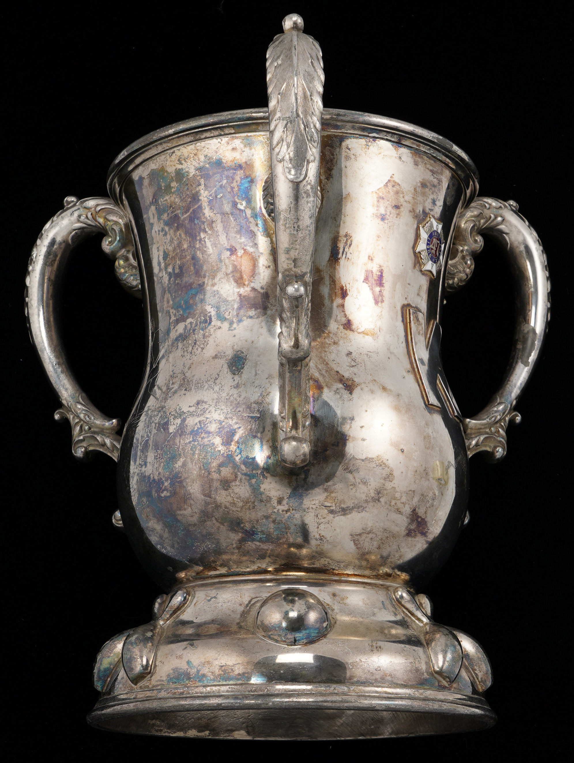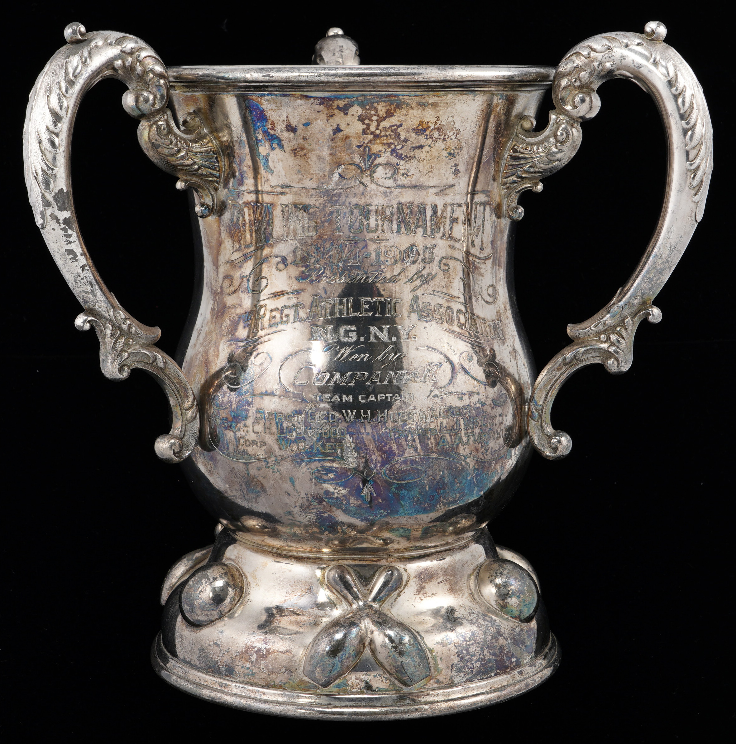 Display-minded antique enthusiasts show some love for this tri-handled loving cup. This ornate trophy is engraved on the front with “Bowling Tournament 1904-1905 17th Regt. Athletic Association N.G. N.Y., Won by Company K, Team Captain Sergt. Geo. W.H. Hudtwalker, 1st Sergt. C.H. Lockwood, Private L.J. McComb, Corp. W.D. Kerr, Private A.A. Turner”. Seen on the back are an engraved bowler in action, and a raised letter K below an NGNY emblem centered by the number 47, which is encircled by the motto “Ducit Amor Patria”. Decorated with bowling balls and crossed pins around the base, this silver-plated trophy stands a hair over 11” tall, with an 8” diameter across the top and bottom. Wear is age-appropriate, mainly in the form of tarnishing, which supports the authentic antique appeal of this captivating presentation piece.
