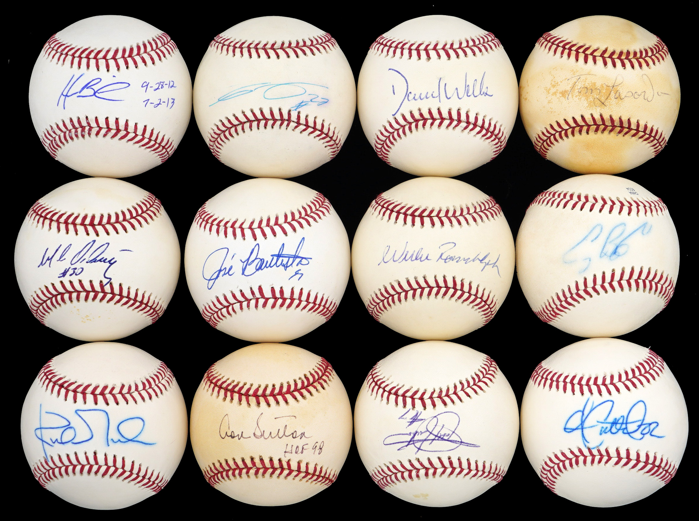 Featured are: Ryan Howard, Mark McGwire, Barry Bonds side panel signature, John Smoltz (HOF) on an Official 1996 World Series ball, "Buster" Posey, Andy Pettitte on a Montreal Expos Series ball, Josh Hamilton, Roger Clemens, Joe Mauer (HOF), Nomar Garciaparra, Rafael Palmeiro on a Mizuno ball, Joey Votto, Jose Bautista, Magglio Ordonez, Andrew McCutchen, Todd Helton (HOF), Don Sutton (HOF) Kirk Gibson, David Wells, Tom Lasorda (HOF), Carlos Gomez, Homer Bailey with "9-28-12, 7-2-13" inscriptions for the dates of two no-hitters, Willie Randolph, Craig Biggio (HOF) on an Official Selig Training ball, Sammy Sosa, Pablo Sandoval, Orel Hershiser, Robinson Cano, Don Larsen with "10-8-56" inscription for his World Series perfect game, R.A. Dickey, Carlos Lee, Koji Uehara, Matt Harvey, and Jeff Samadzija.