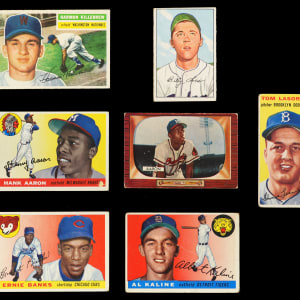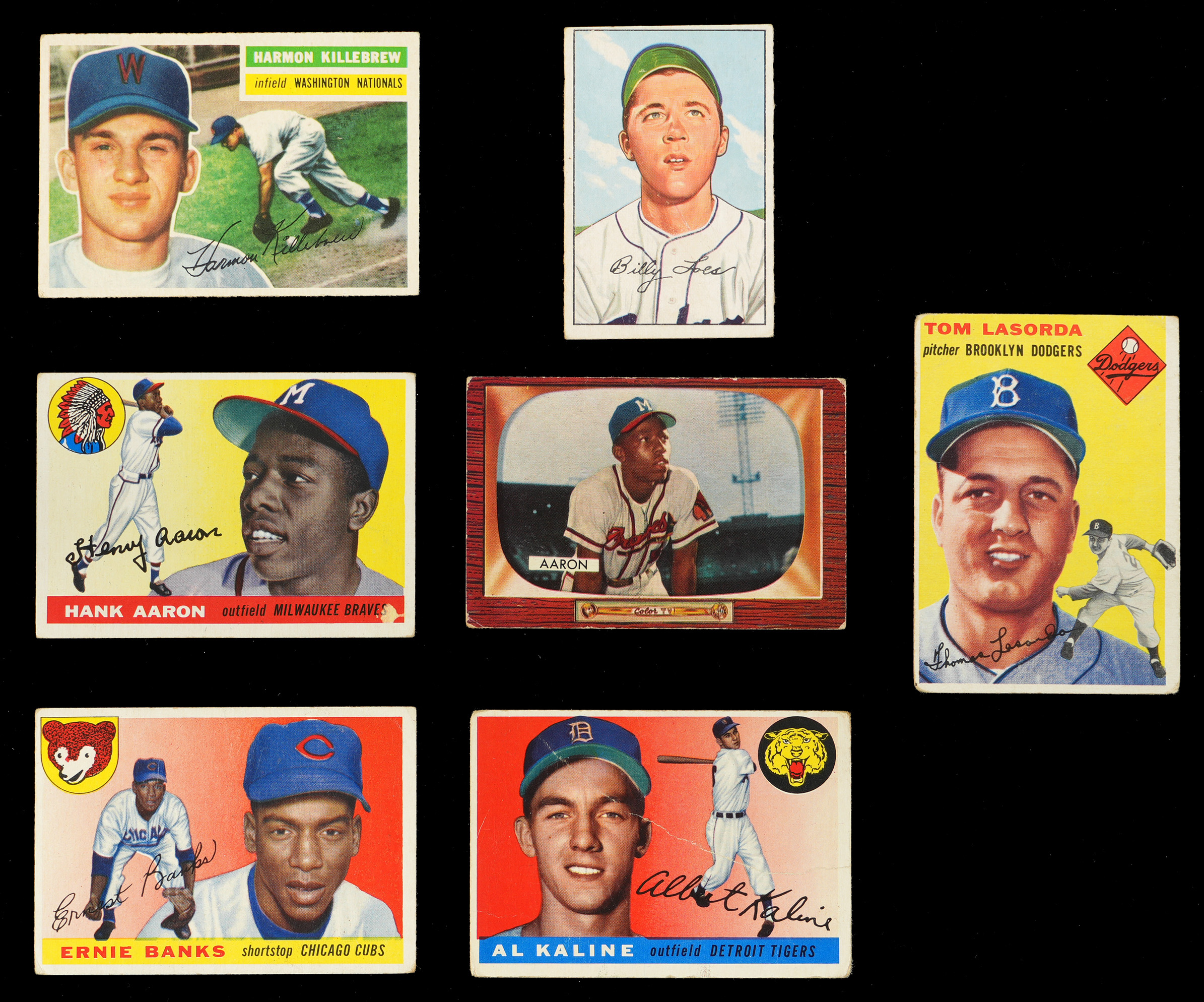 Pick up these seven 1952-1956 Hall of Fame/star player rookie and second year singles. Includes: 1952 Bowman: #240 Loes RC (GD); 1954 Topps: #132 Lasorda RC (FR); 1955 Bowman: #179 Aaron (FR); 1955 Topps: (3 cards) with #4 Kaline (PR), #28 Banks (FR), #47 Aaron (GD) and 1956 Topps: #164 Killebrew (VG).