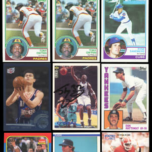 Presented is a 1983-2002 multi-sport rookie and star collection of (40) cards. Highlights include: Baseball Stars: (29 cards) with 1983 Topps: #83 Sandberg RC (NM), (2) #482 Gwynn RC (NM-MT, EX); 1984 Fleer #131 Mattingly RC (NM-MT), 1984 Topps #8 Mattingly RC (NM), 1985 Fleer #155 Clemens RC (NM-MT), 1985 Topps #536 Puckett RC (EX-MT), 1989 Donruss #33 Griffey Jr. RC (EX), (2) 1989 Fleer #546 Griffey Jr. RC (both NM-MT); Football Stars: (5 cards) with signed 1991 Pro Set #44 H. Walker ("8-9", card NM); Basketball Stars: (6 cards) with 1986-1987 Fleer #1 Abdul-Jabbar (EX), signed 1995-1996 Collector's Choice #286 S. O'Neal ("9", card creased, Auction LOA from James Spence/JSA) and 2002-2003 Topps Chrome #146 Ming RC (NM-MT, English back). Signed material comes with an Auction LOA from James Spence/JSA.