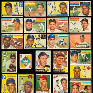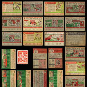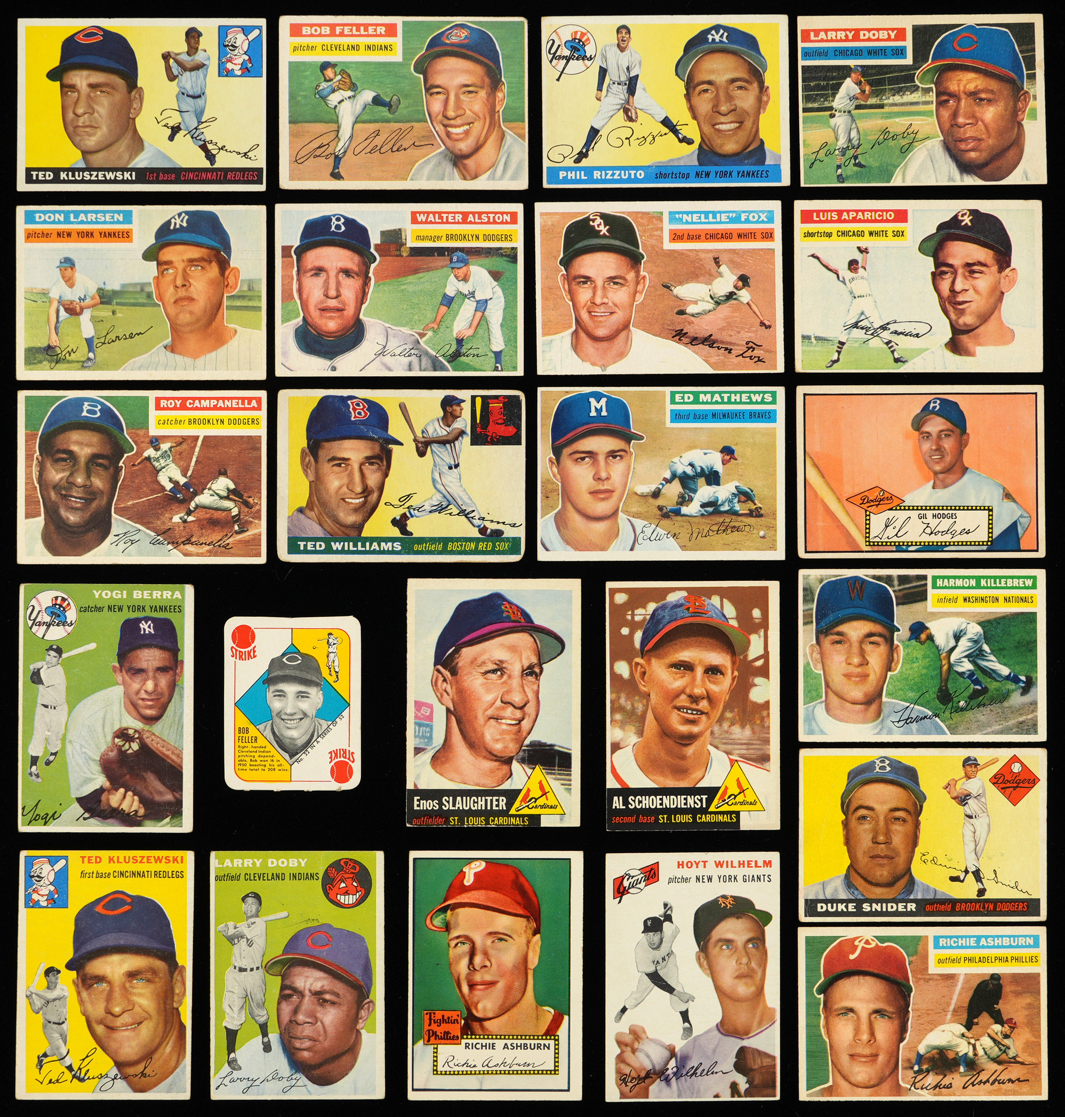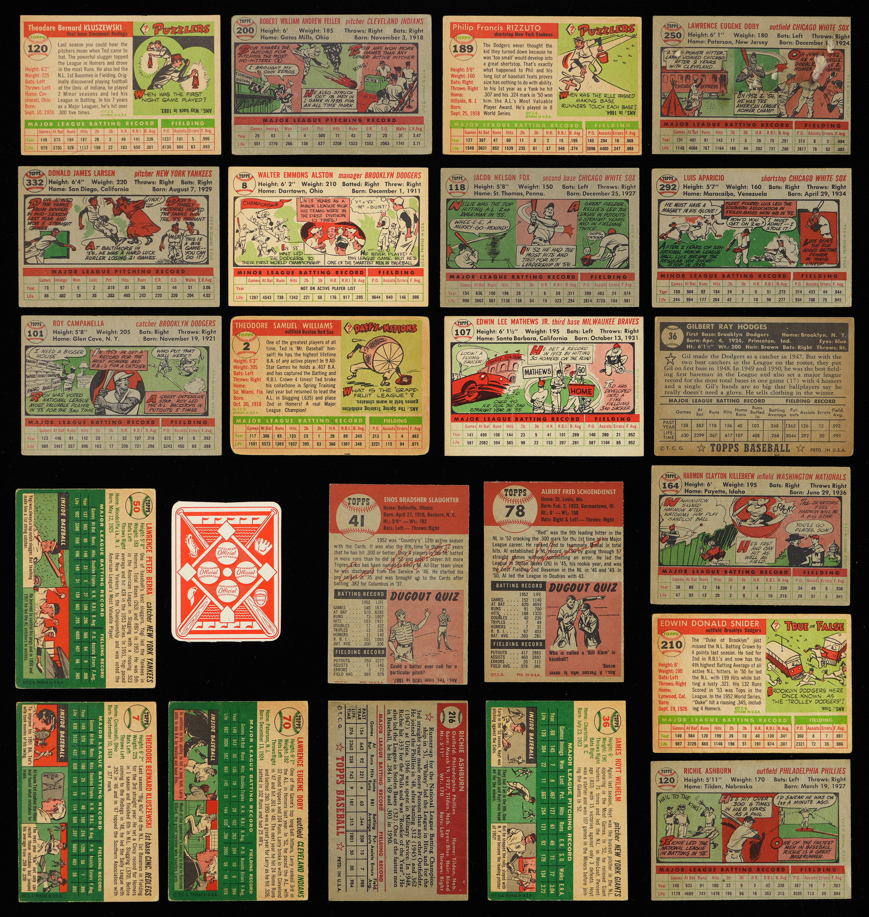 "Golden age" gallery of (23) 1951-1956 Topps Hall of Fame and star cards. Includes: 1951 Topps Red Backs: #22 Feller (EX-MT); 1952 Topps: (2 cards) with #36 Hodges (VG, bb), #216 Ashburn (VG); 1953 Topps: (2 cards) with #41 Slaughter (VG), #78 Schoendienst (VG-EX); 1954 Topps: (4 cards) with #7 Kluszewski (VG), #36 Wilhelm (VG), #50 Berra (GD), #70 Doby (GD); 1955 Topps: (4 cards) with #2 T. Williams (PR), #120 Kluszewski (GD), #189 Rizzuto (GD), #210 Snider (FR); 1956 Topps: (10 cards) with #8 Alston (EX), #101 Campanella (VG), #107 Mathews (GD), #118 Fox (VG-EX), #120 Ashburn (EX), #164 Killebrew (VG), #200 Feller (GD), #250 Doby (PR, paper loss), #292 Aparicio RC (VG) and #332 Larsen (VG).