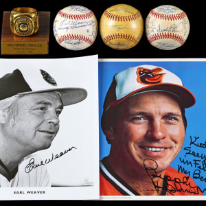 Also included is an oversized gold ring from a 1988 series of Old-Timer games, “The Equitable Series” mounted on a stand with the plaque, “Baltimore Orioles Memorial Stadium - August 7th, 1988.”