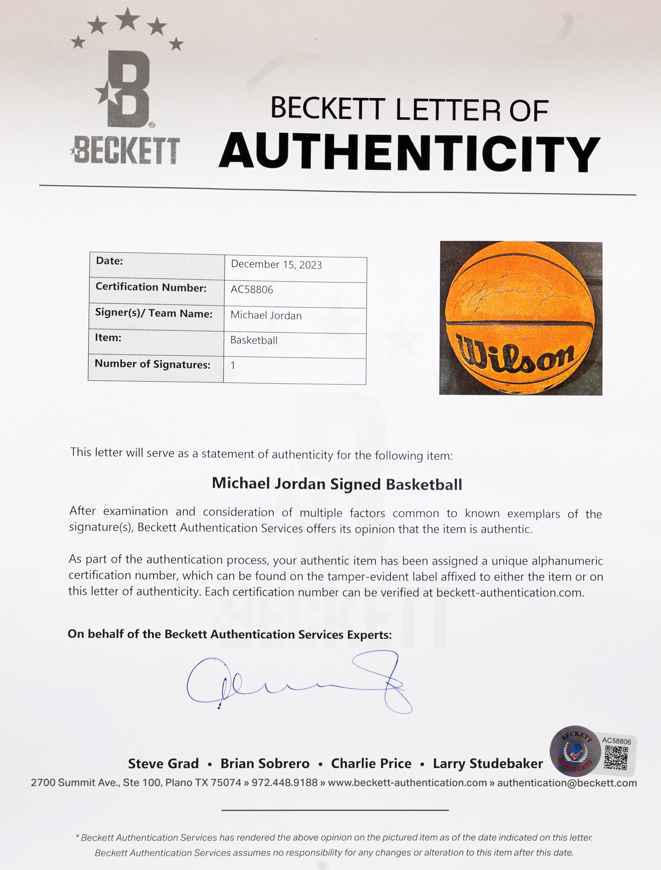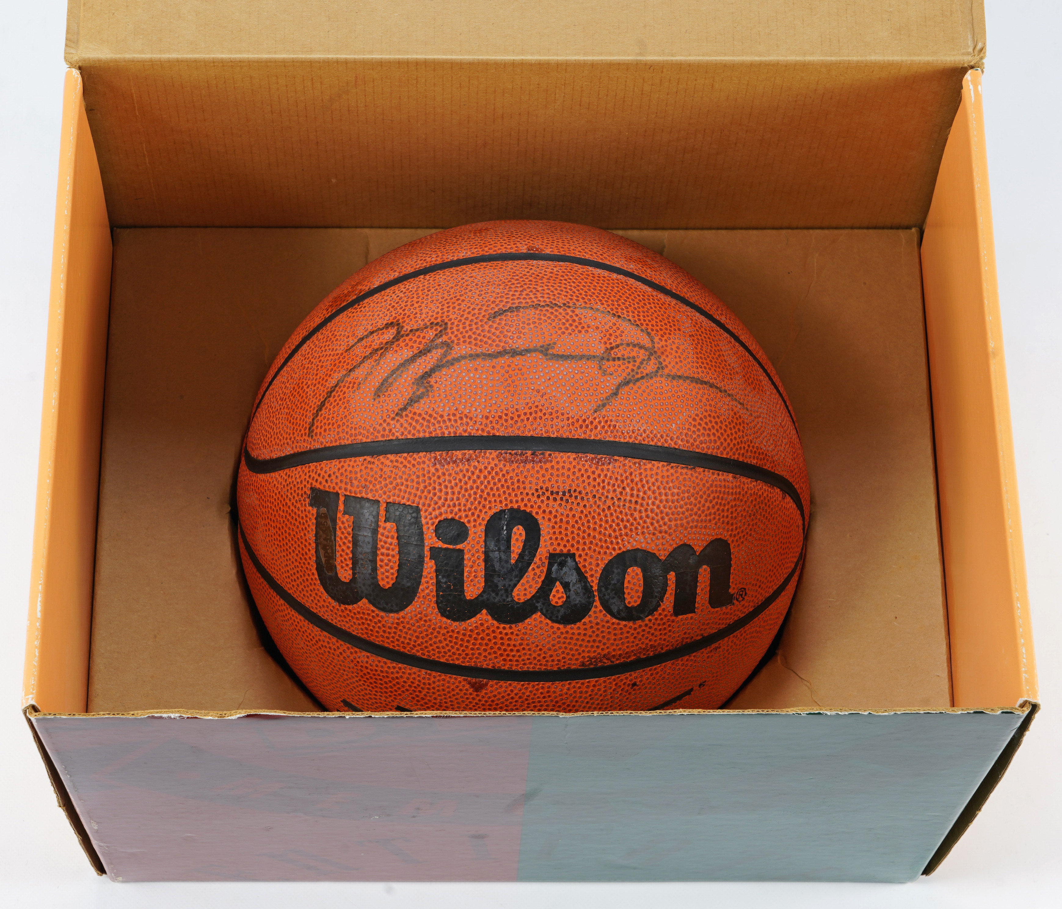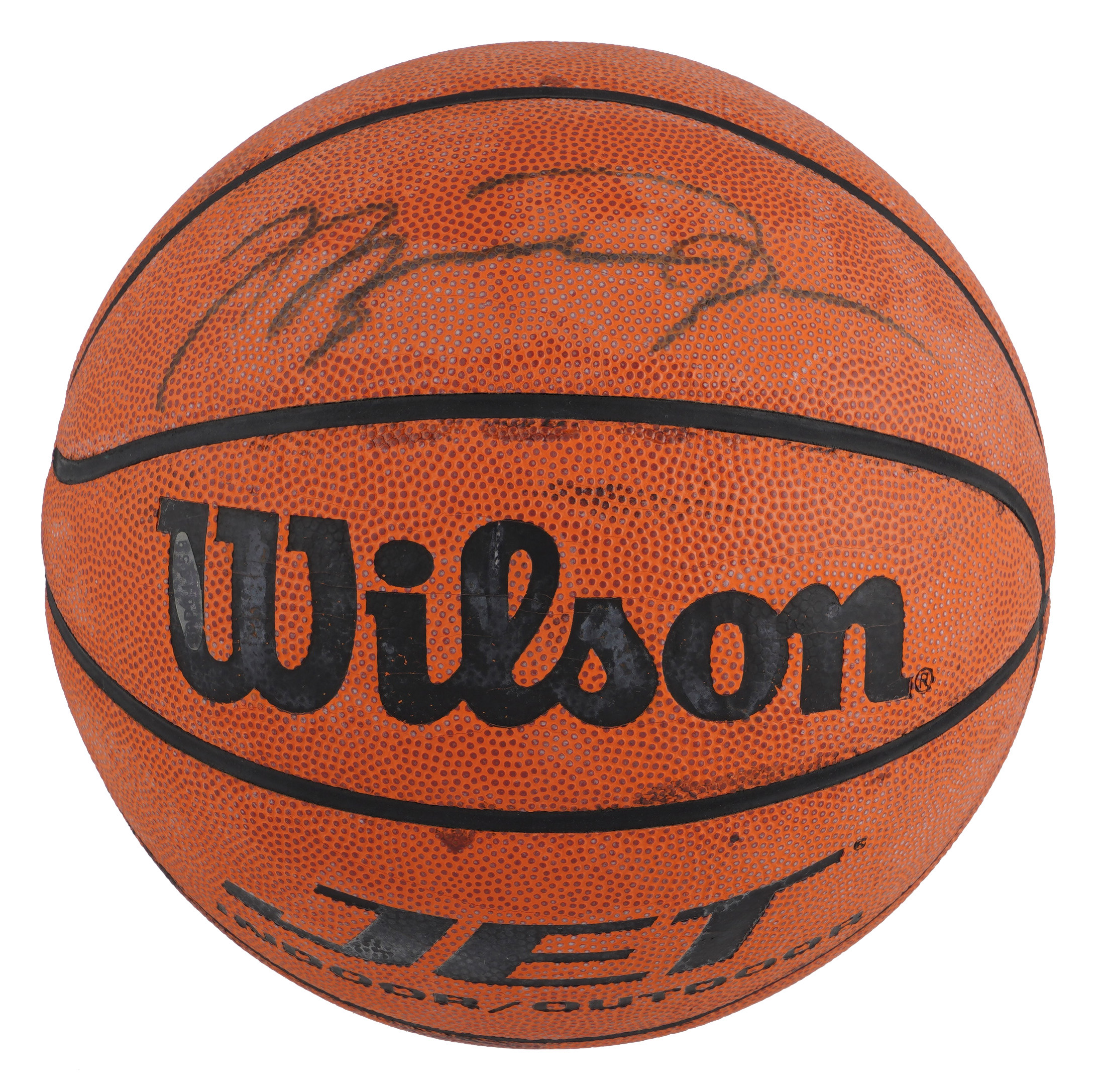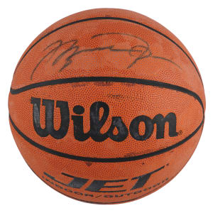 Level up your autograph collection, with the acquisition of this Michael Jordan single-signed Wilson basketball. This double-certified rock is a Jet model, which is fitting, as you are now flying "Air Jordan". Though the color of this ball is somewhat mottled, and sporadic staining is evident, Jordan's jumbo signature remains bold and pleasing. This prized signature is a massive 8" wide application, hogging up most of the space on the panel directly above the Wilson logo. Fans under the false impression that any of the tall trees lumbering about today's NBA courts are better players than Jordan, should review the archive footage, for Jordan is truly basketball's "GOAT".