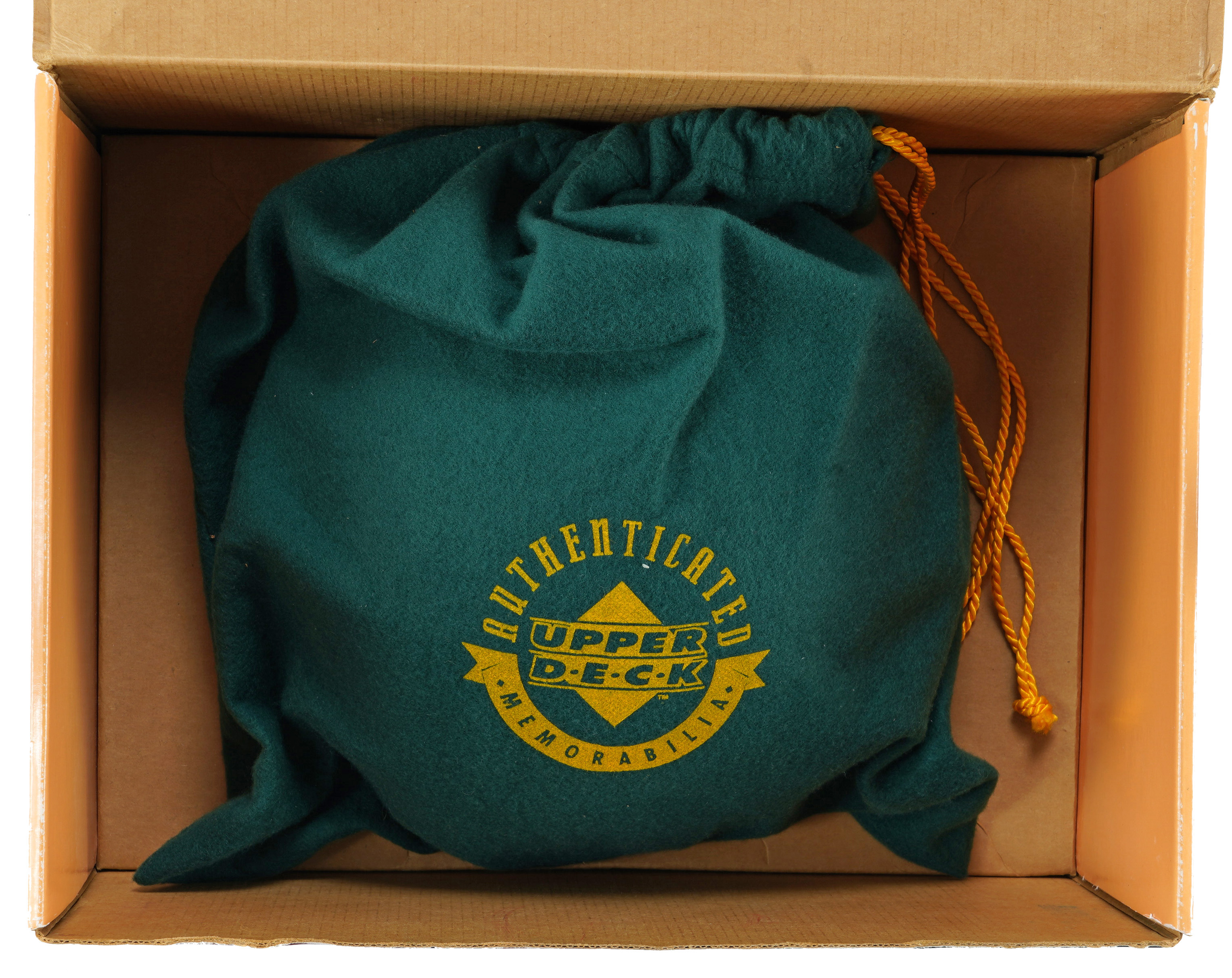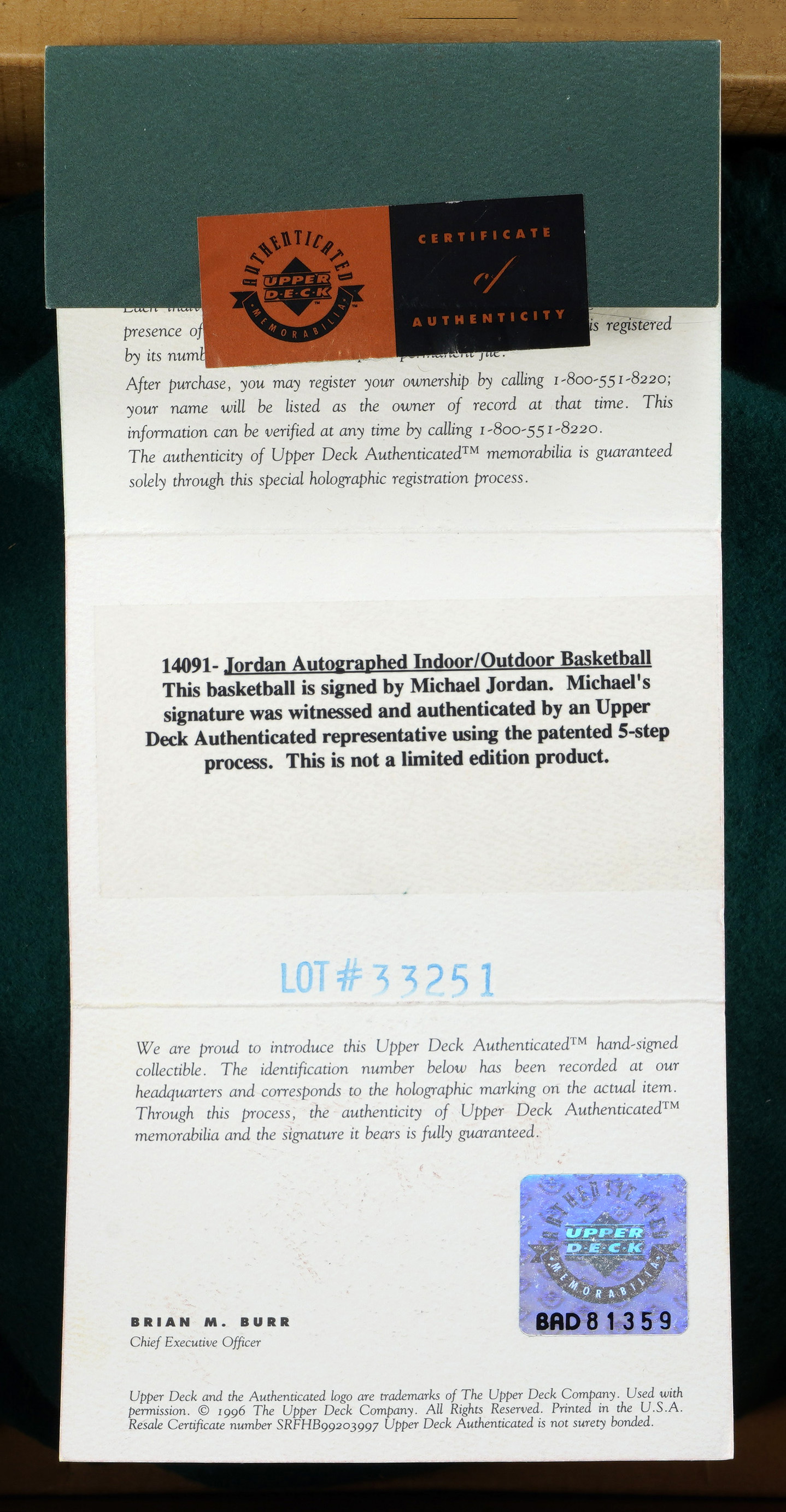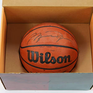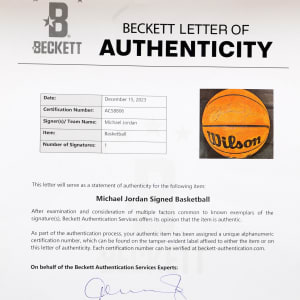 Level up your autograph collection, with the acquisition of this Michael Jordan single-signed Wilson basketball. This double-certified rock is a Jet model, which is fitting, as you are now flying "Air Jordan". Though the color of this ball is somewhat mottled, and sporadic staining is evident, Jordan's jumbo signature remains bold and pleasing. This prized signature is a massive 8" wide application, hogging up most of the space on the panel directly above the Wilson logo. Fans under the false impression that any of the tall trees lumbering about today's NBA courts are better players than Jordan, should review the archive footage, for Jordan is truly basketball's "GOAT".