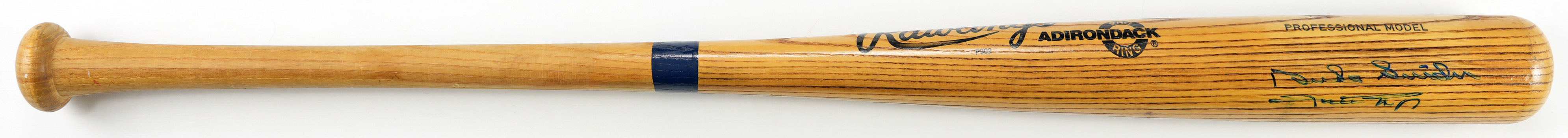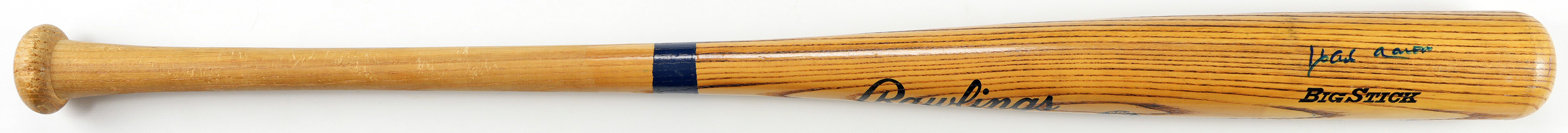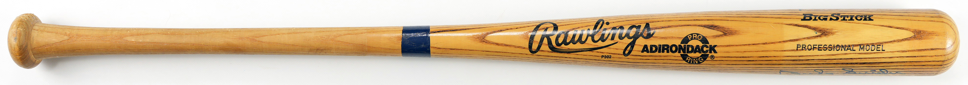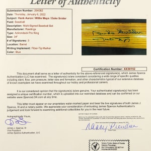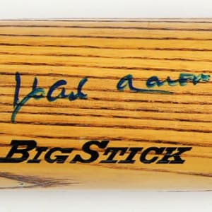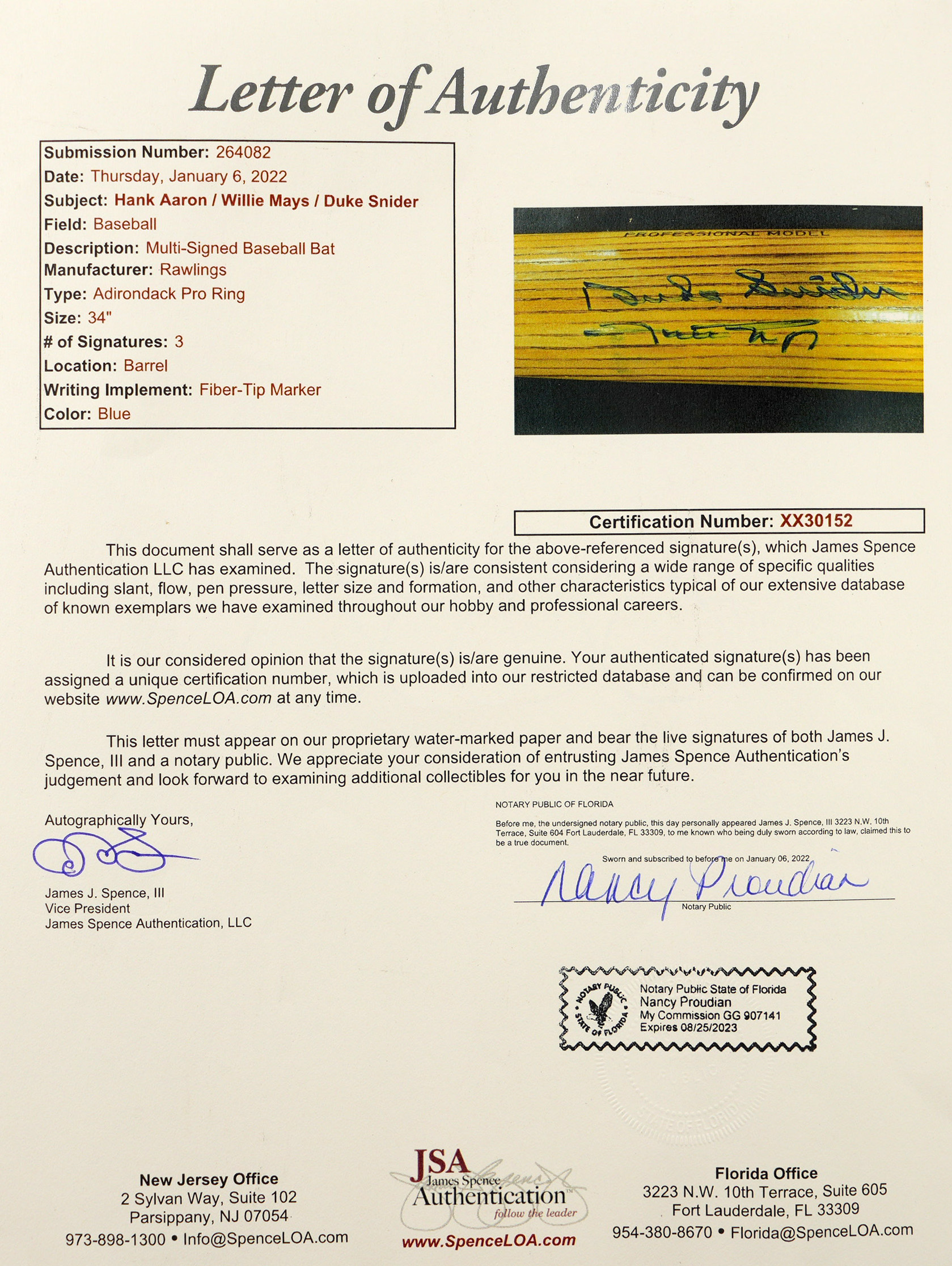 Heavy hitters Hank Aaron, Willie Mays and "Duke" Snider are collected with this triple-signed bat. These National League standouts combined for a grand total of 1,822 home runs, earning them bronze plaques in the Hall of Fame. While this Adirondack Pro Ring bat is a bit chewed up on the knob and handle, the barrel is unmolested, and the prized signatures show off handsomely.