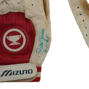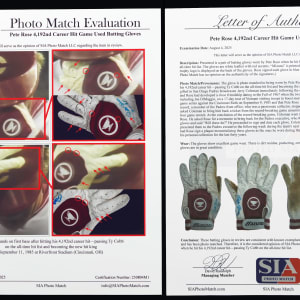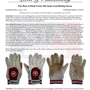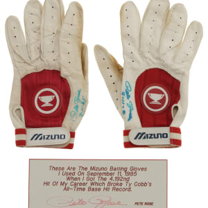 The gloves show moderate to heavy usage, including heavy dirt stains on the palms, indicative of Rose's tough play and propensity for head-first slides. The gloves have been photomatched to the record-breaking game by Sports Investors Authentication. At a later date, our consignor had a small plaque created to memorialize the gloves in his personal display of memorabilia from his career. The plaque reads "These Are The Mizuno Batting Gloves I Used On September 11, 1985 When I Got The 4,192nd Hit Of My Career Which Broke Ty Cobb's All-Time Base Hit Record." Pete Rose has signed the plaque at the bottom in red marker. Offered elsewhere in this auction are additional mementos from this historic event. The lineup cards from the record-breaking game, including the Reds' card signed by Pete Rose as player-manager, were also gifted to and saved by our consignor and kept alongside the gloves for the last 40 years! This is an incredible offering, made public for the first time ever, dating from one of baseball's most iconic records! Accompanied by a full LOA from Sports Investors Authentication for the photomatch as well as a consignor Letter of Provenance.