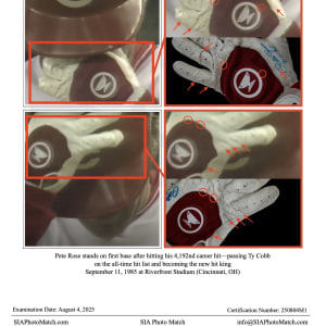At the conclusion of the game, Jerry Coleman visited with Rose in the Reds' locker room to congratulate him on the accomplishment. Coleman said to Rose, "Pete, you've got to give me something from tonight for (the Padres executive)." Pete held up the batting gloves he'd worn and said, "Would this do?" Coleman replied, "Yes, but you’ll have to autograph and date them because you know how (he) is." Coleman then safely tucked the pair of gloves away, continued on to Houston for a three-game series against the Astros before returning home to San Diego for a series against the Dodgers. It was before that game that Coleman presented the gloves, opening with "I didn't get a ticket from the Rose game as you asked, but I thought you'd be okay with these." Sitting on his desk was this historic memento — the batting gloves worn during the record-breaking game. Rose signed the left glove on the inside part adjacent to the thumb ("Pete Rose 9-11-85").