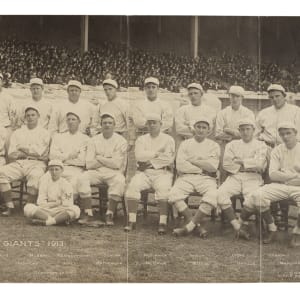 Panoramic photograph of the National League Champion New York Giants taken at the Polo Grounds in 1913. The photo captures 29 members of the club in a classic team pose, including Jim Thorpe, Christy Mathewson, John McGraw (Mgr.), Wilbert Robinson (coach), Rube Marquard, Hooks Wiltse, Chief Meyers, and Fred Merkle. The caption along the base reads "New York 'Giants' 1913." Each player has been identified in print along the base. The photographer's copyright "Pach Bros., N. Y.," appears in the lower-right corner. The Giants captured their third consecutive pennant in 1913, but, like the two previous years, they once again fell victim to their American League rivals in the World Series. 1913 also marked Jim Thorpe's first Major League season. A gold-medal winner in the 1912 Summer Olympics in Sweden, Thorpe returned home and began a professional baseball career that lasted six seasons. He appeared in just nineteen games with the Giants during his inaugural season, finishing the year with a home run, two RBI, and a .143 batting average. The piece, which measures 21 x 9 inches, is printed on paper stock, shows light wear along the edges and four vertical folds. It is otherwise bright and clean. The reverse is heavily toned. This is an outstanding piece with several notable names from this classic 1910-era New York Giants team. The size/weight of this item requires that there will be an additional shipping charge for this lot.