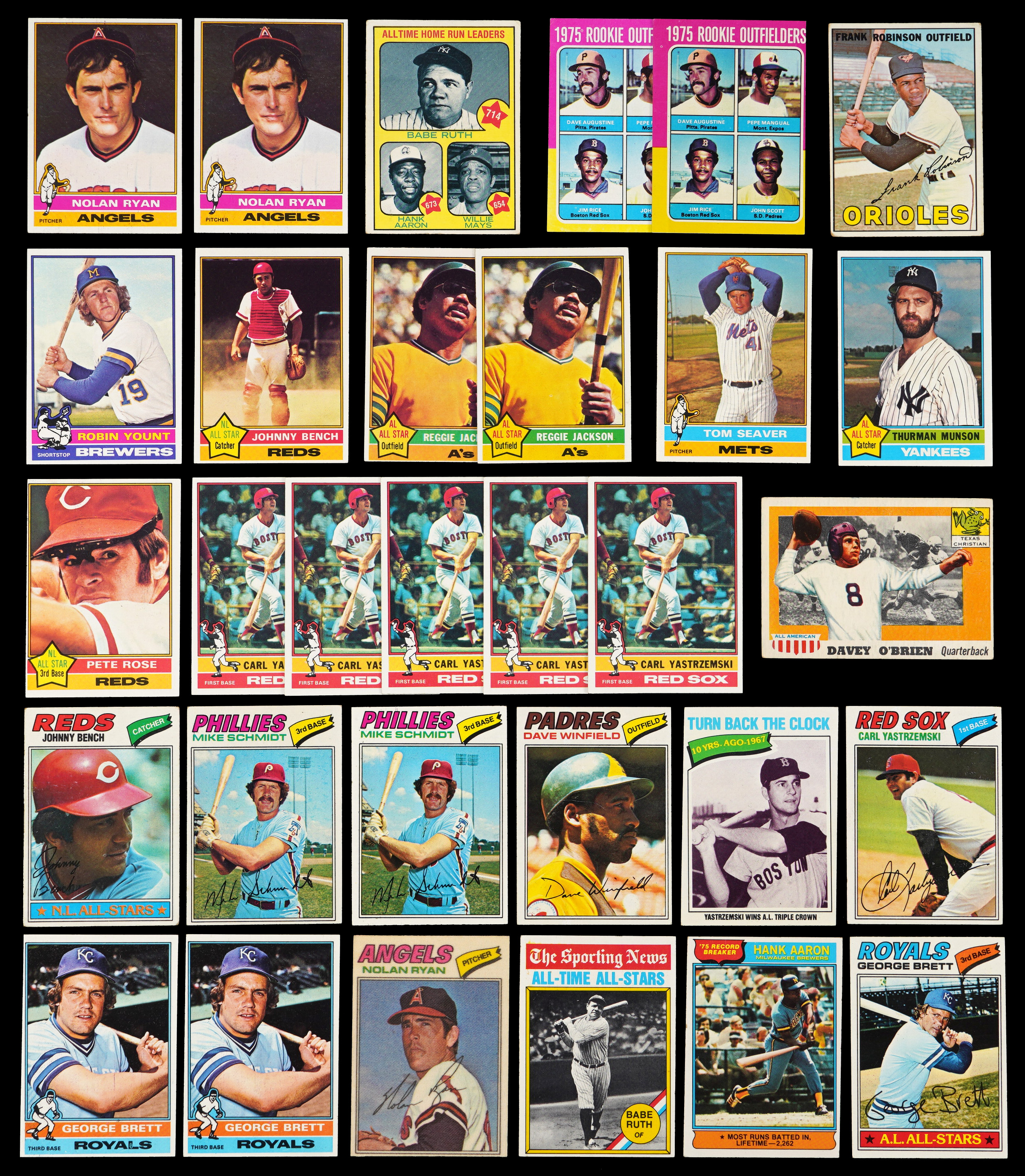 1970s Baseball: (773 cards, average EX to EX-MT) with (19) 1970 Topps, (5) 1970 Topps Super, (26) 1971 Topps: (includes one high number) with #210 Carew (FR); (11) 1971 Topps Super: #37 Clemente (EX-MT); (155) 1972 Topps: #37 Yastrzemski (EX); (191) 1973 Topps: #1 Ruth/Aaron/Mays (VG), (3) #174 Gossage RC (VG-EX, (2) VG), signed #235 Hunter (card VG, auto “10”), (2) #330 Carew (EX, VG), #380 Bench (FR); (65) 1974 Topps, (1) 1975 Hostess, (54) 1975 Topps: #1 Aaron HL (EX-MT), #260 Bench (EX), (2) #616 Rice RC (VG-EX, VG); (76) 1976 Topps: #1 Aaron RB (VG-EX), (2) #19 Brett (both VG-EX), #98 Eckersley RC (EX), (5) #230 Yastrzemski (average EX-MT), #240 Rose (VG), #300 Bench (EX), #316 Yount (EX-MT), (2) #330 Ryan (EX-MT, EX), #345 Ruth ATG (VG-EX), (2) #500 R. Jackson (VG-EX, VG), (3) #550 Aaron (VG-EX, (2) VG), #600 Seaver (EX), #650 Munson (EX-MT); (41) 1977 Topps: #473 Dawson RC (EX), #580 Brett (VG); (1) 1977 Topps Cloth Sticker #40 Ryan (EX-MT), (119) 1978 Topps: (includes one signed) with #36 Murray RC (EX-MT), #707 Molitor/Trammell RC (EX-MT); (9) 1979 Topps;