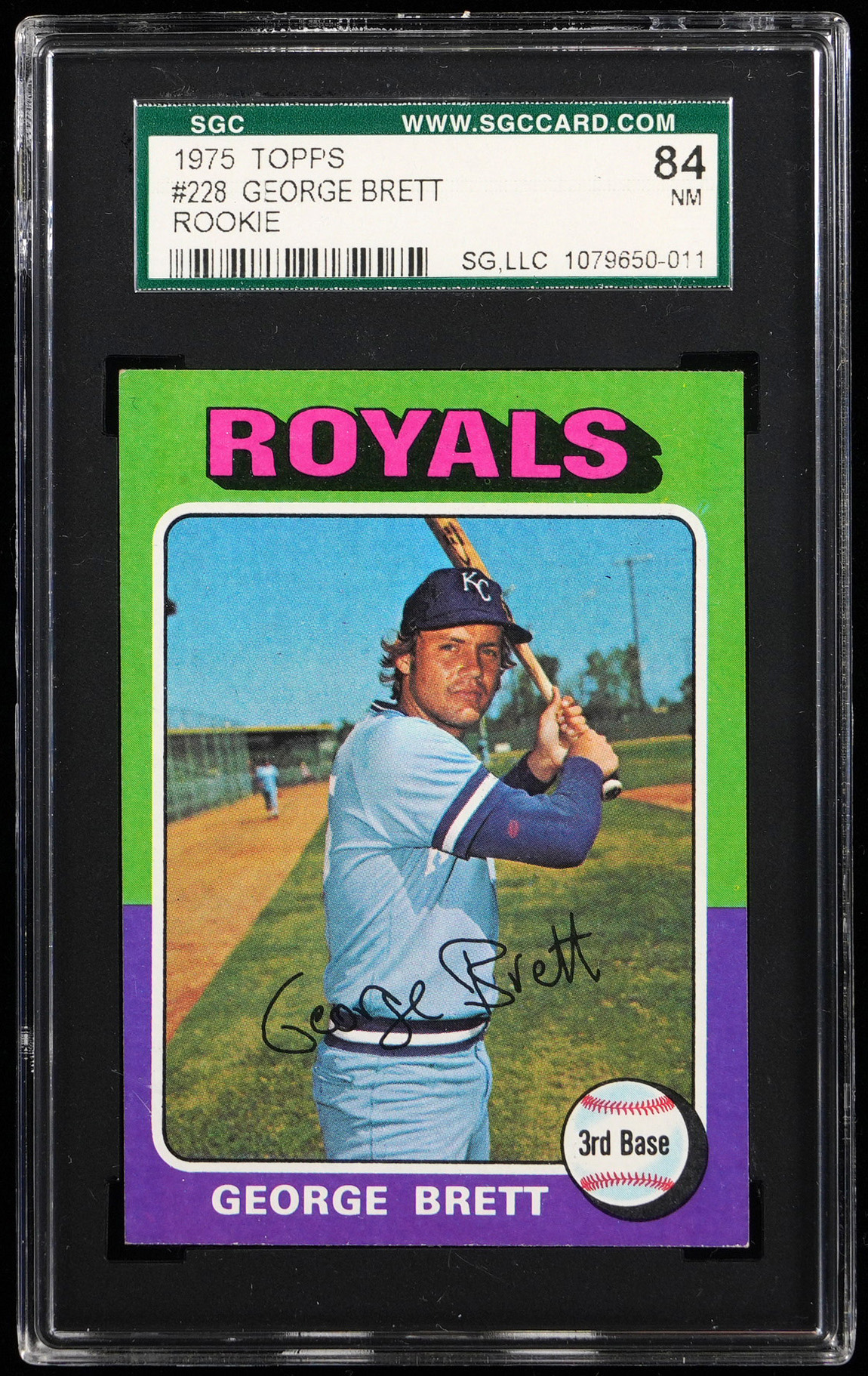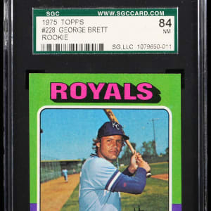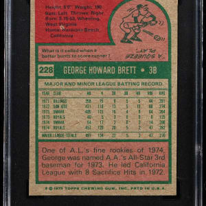 Graded NM 7 by SGC. Keynote 1975 Topps #228 George Brett rookie card. Kansas City Royals Hall of Famer.