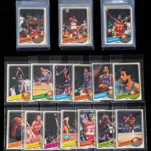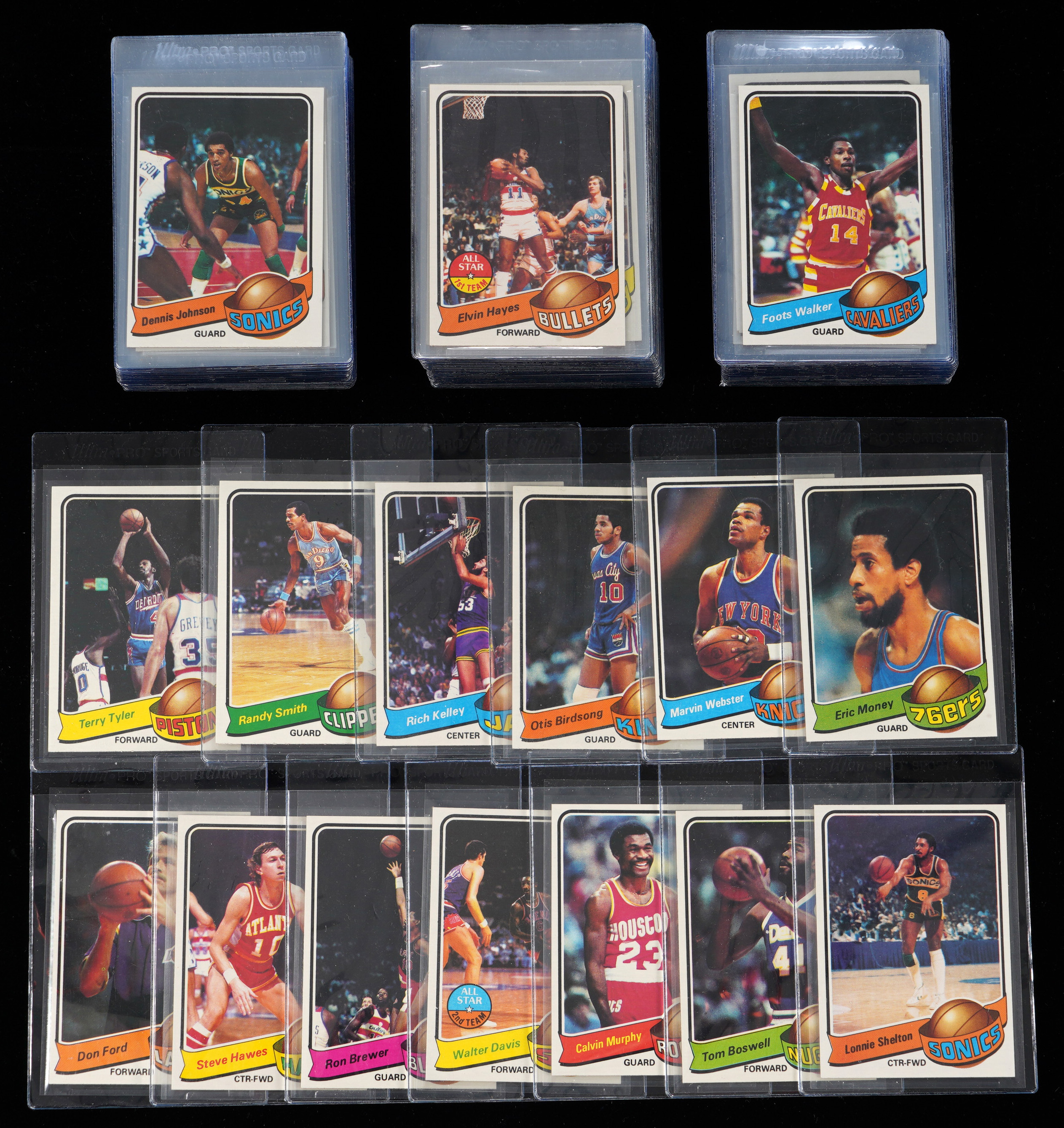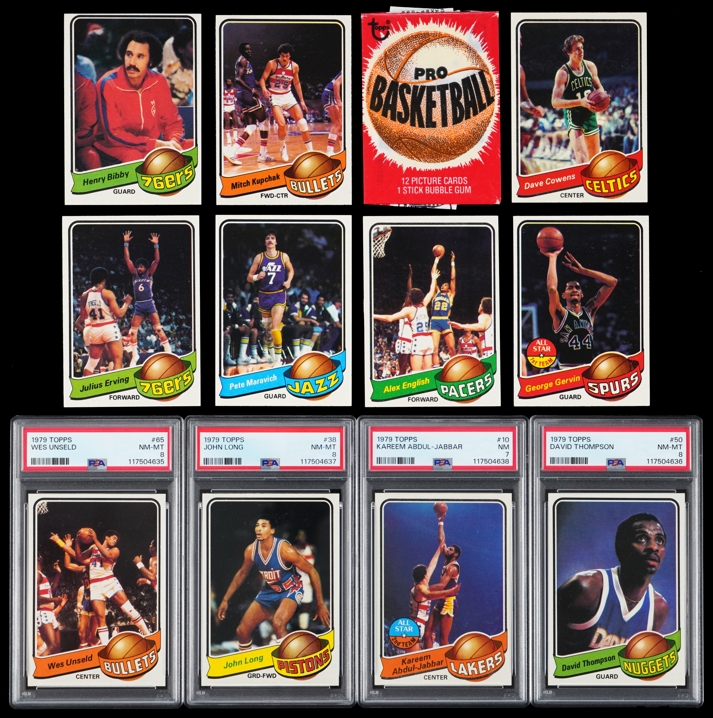 Swoop in to pick up these hoop stars! The offered 1979-1980 Topps Basketball high-grade complete set of (132) cards with four PSA graded stars generally presents in the (NM to NM-MT) range. A crisply folded wax pack wrapper is also present. Highlights include: #1 Gervin (EX-MT), #10 Abdul-Jabbar (PSA NM 7), #20 Erving (NM-MT), #31 English RC (EX-MT), #38 Long (PSA NM-MT 8), #50 D. Thompson (PSA NM-MT 8), #60 Maravich (EX-MT) and #65 Unseld (PSA NM-MT 8).